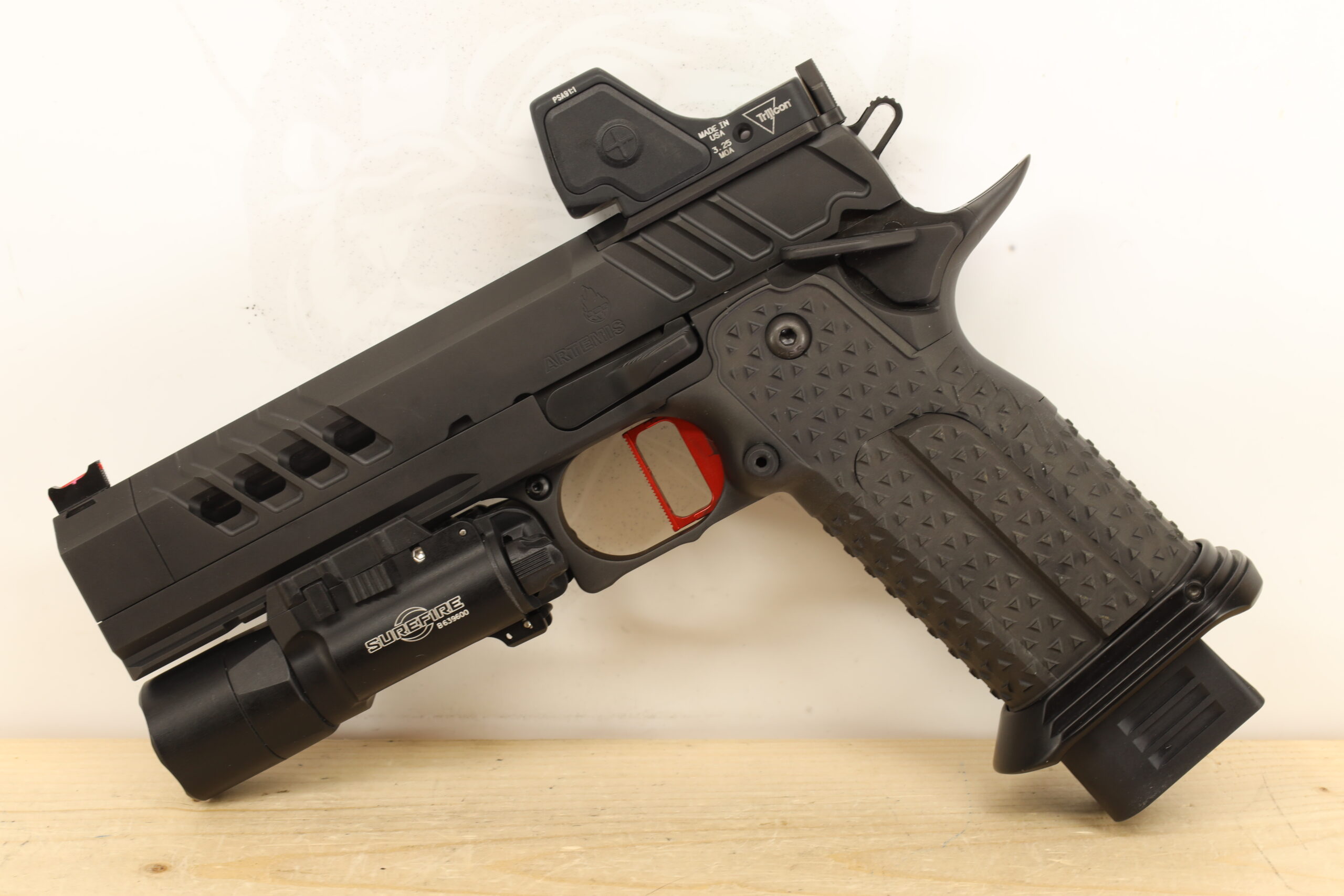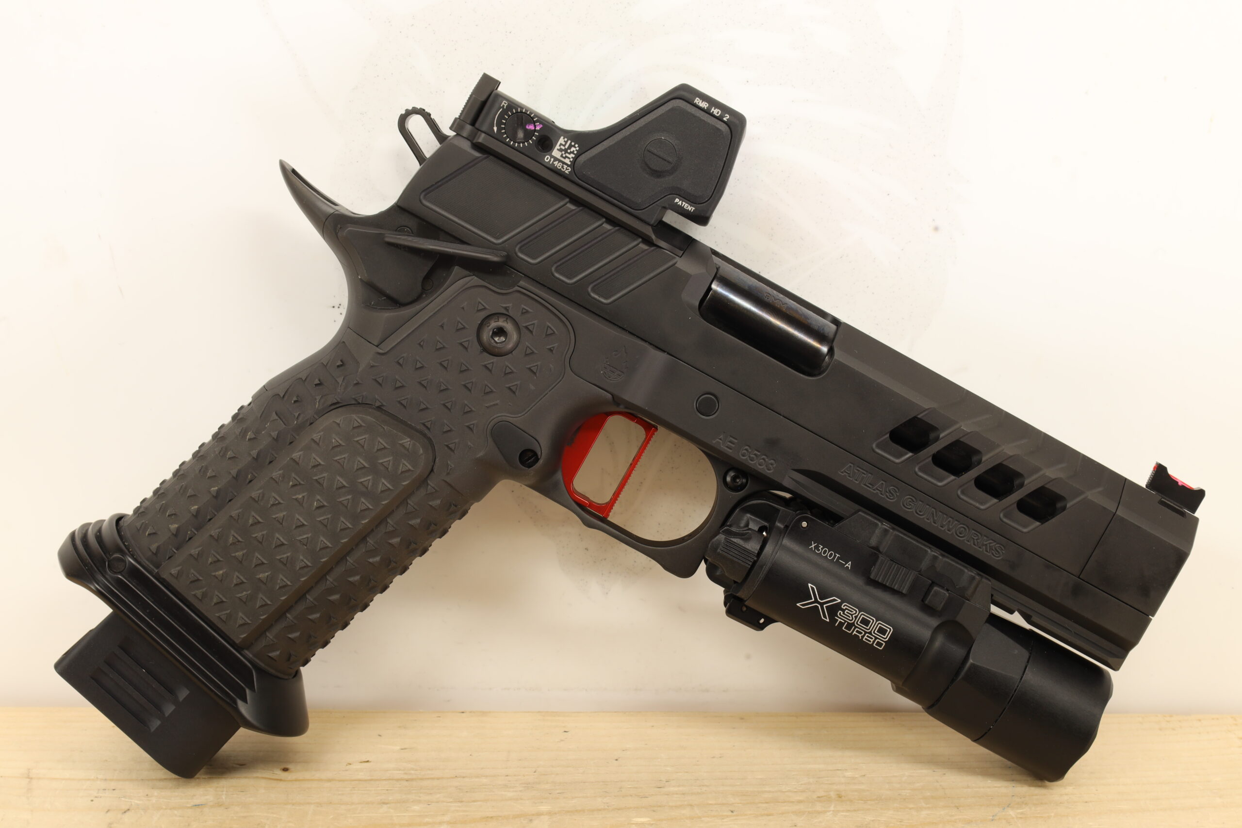 The Atlas Gunworks Artemis 9x19mm is a high-end, precision-made firearm known for its flawless performance and construction. This model includes a 4.5-inch barrel and a TRIJICON RMR-HD-2 optic, providing robust and precise shooting experiences. Despite being used, this exquisite piece maintains its great condition, with thumb safety and light rounding off its comprehensive feature set.