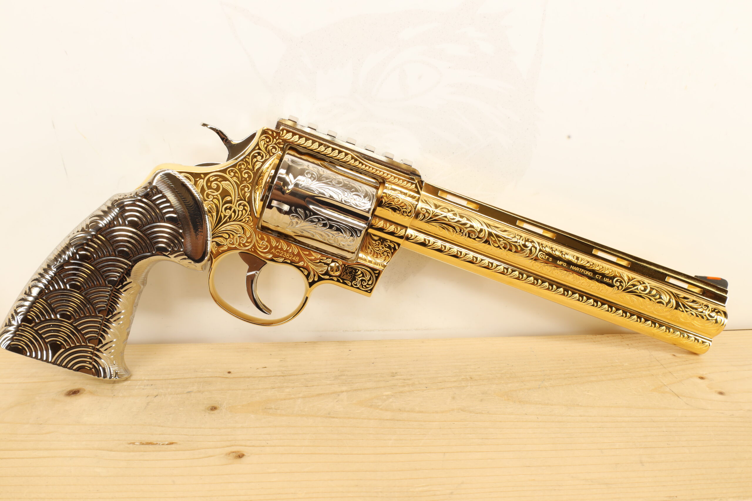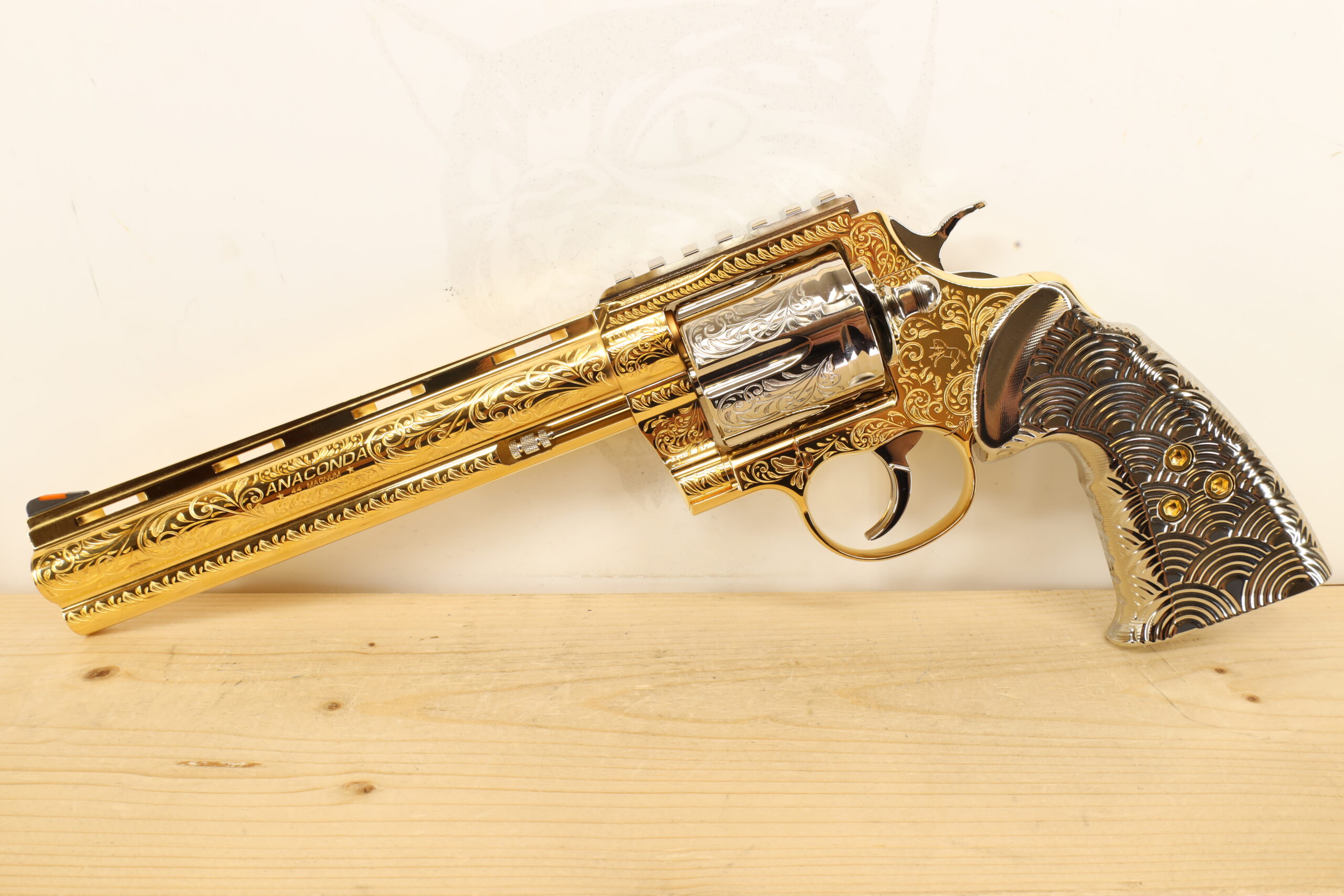 The Colt Anaconda in 44 MAGNUM is a powerful revolver with an 8-inch barrel and a 6-round capacity. Renowned for its mighty performance, the Anaconda is one of Colt’s premier revolvers. Colt has been a leading handgun manufacturer for centuries and the Anaconda maintains its legendary standing. It is new and comes in a sturdy case, with a Purse, Knife, and Brass Knuckles