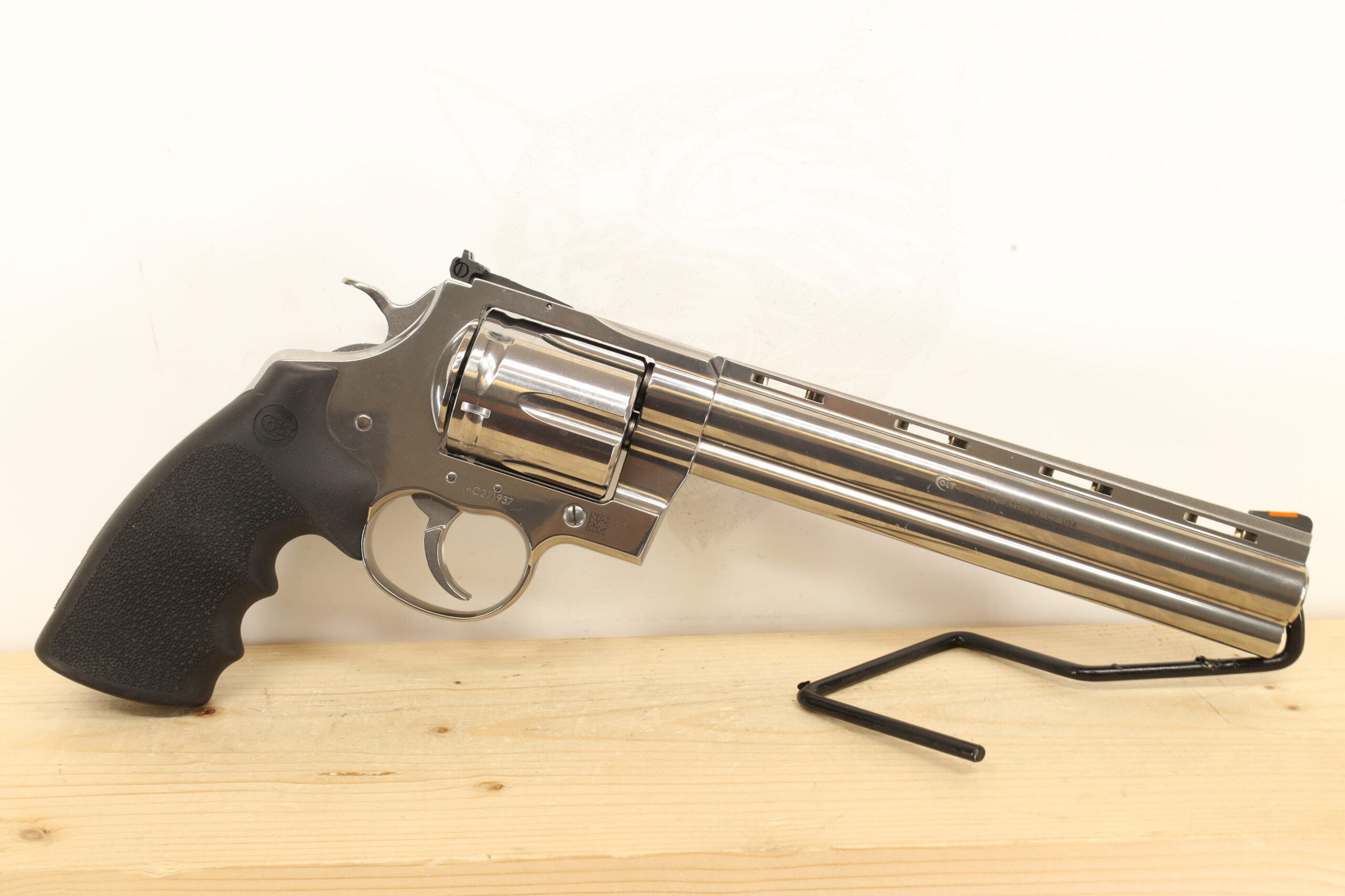 The Colt Anaconda, chambered for 44 Magnum rounds, embodies Colt’s tradition of creating high-quality firearms. This six-shooter with its 8″ barrel exudes power and reliability. Though used, it has been maintained in great condition and effortlessly returns the unique shooting experience iconic to Colt revolvers.