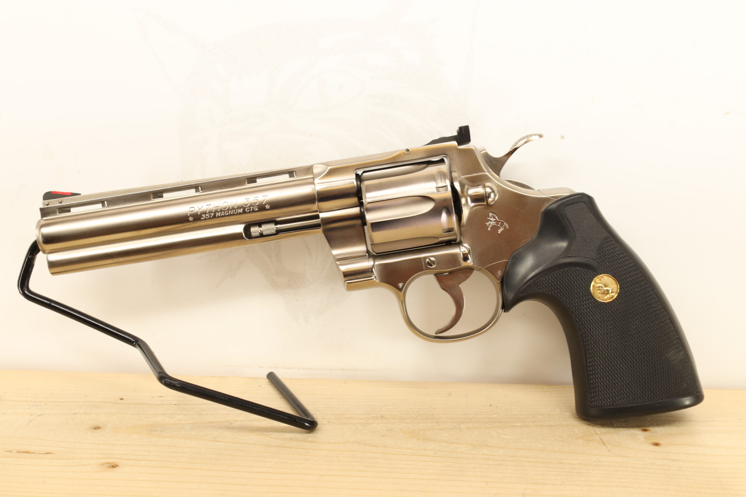The Colt Python 357MAG is a renowned revolver for its accuracy, smooth trigger pull, and superb craftsmanship. This model has a 6″ barrel and houses a 6-shot cylinder, designed for the .357 Magnum round. It’s worth noting that Colt’s Python series has stood the test of time, demonstrating consistent performance and durability. This specific firearm includes an original box or bag for safekeeping.