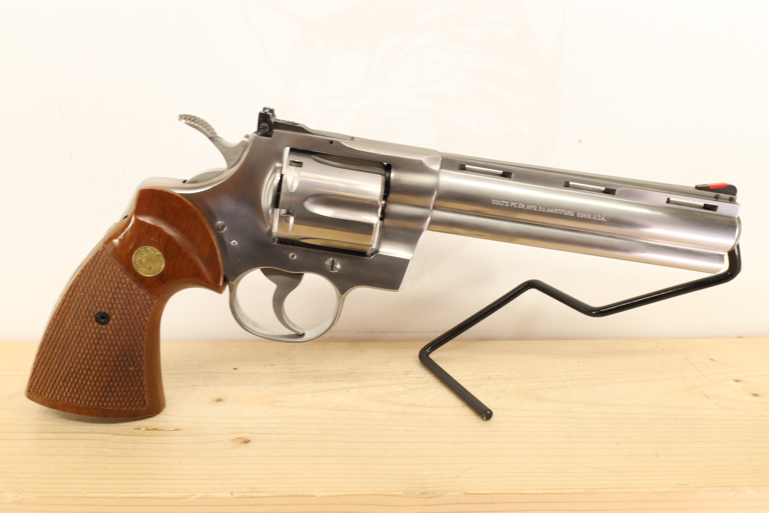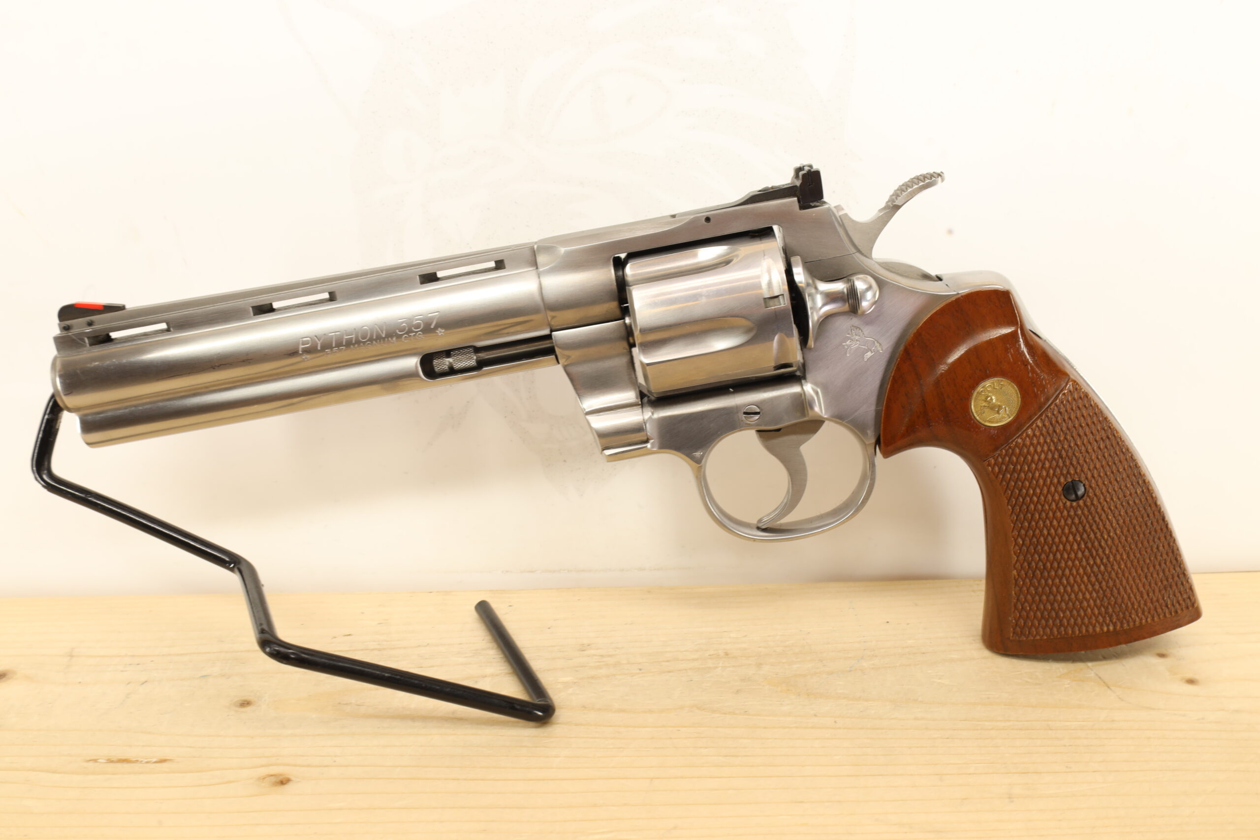 Colt Python 357MAG model which bears the same excellently crafted 6″ barrel and 6-shot configuration. As part of the Python series, it offers impressive performance, easily maintaining Colt’s high standards of quality and durability. It comes with a box or a bag for safe storage.