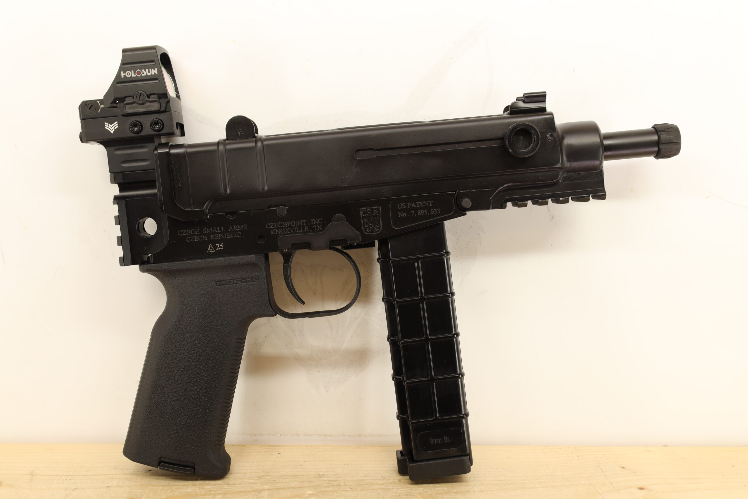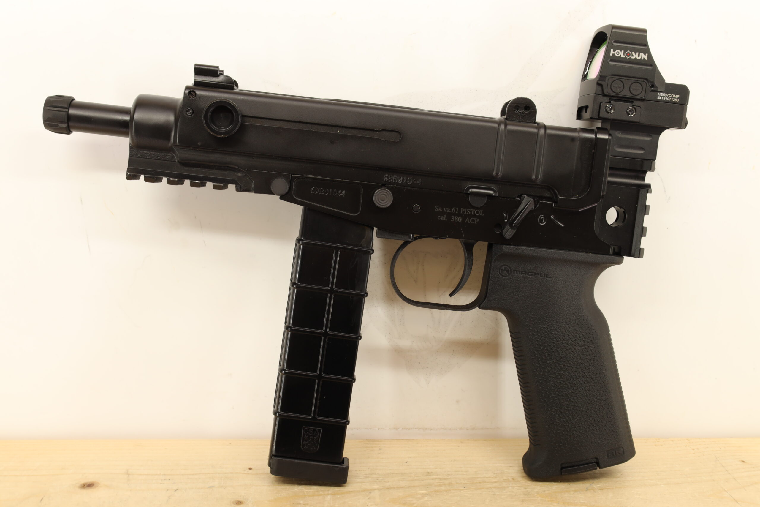 The Czech Small Arms VZ.61 in 380 ACP is a testament to their reputation for crafting exceptional firearms. Despite being previously owned, this specific piece is in perfect condition, including a 4.4″ threaded barrel, ready for any compatible attachment. Equipped with a HOLOSUN REDDOT optic and thumb safety feature, it comes with a single magazine and is encased neatly for shipment.