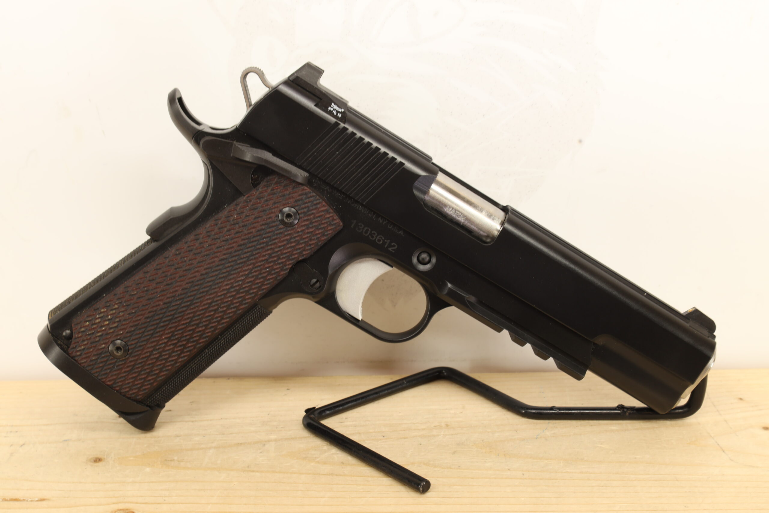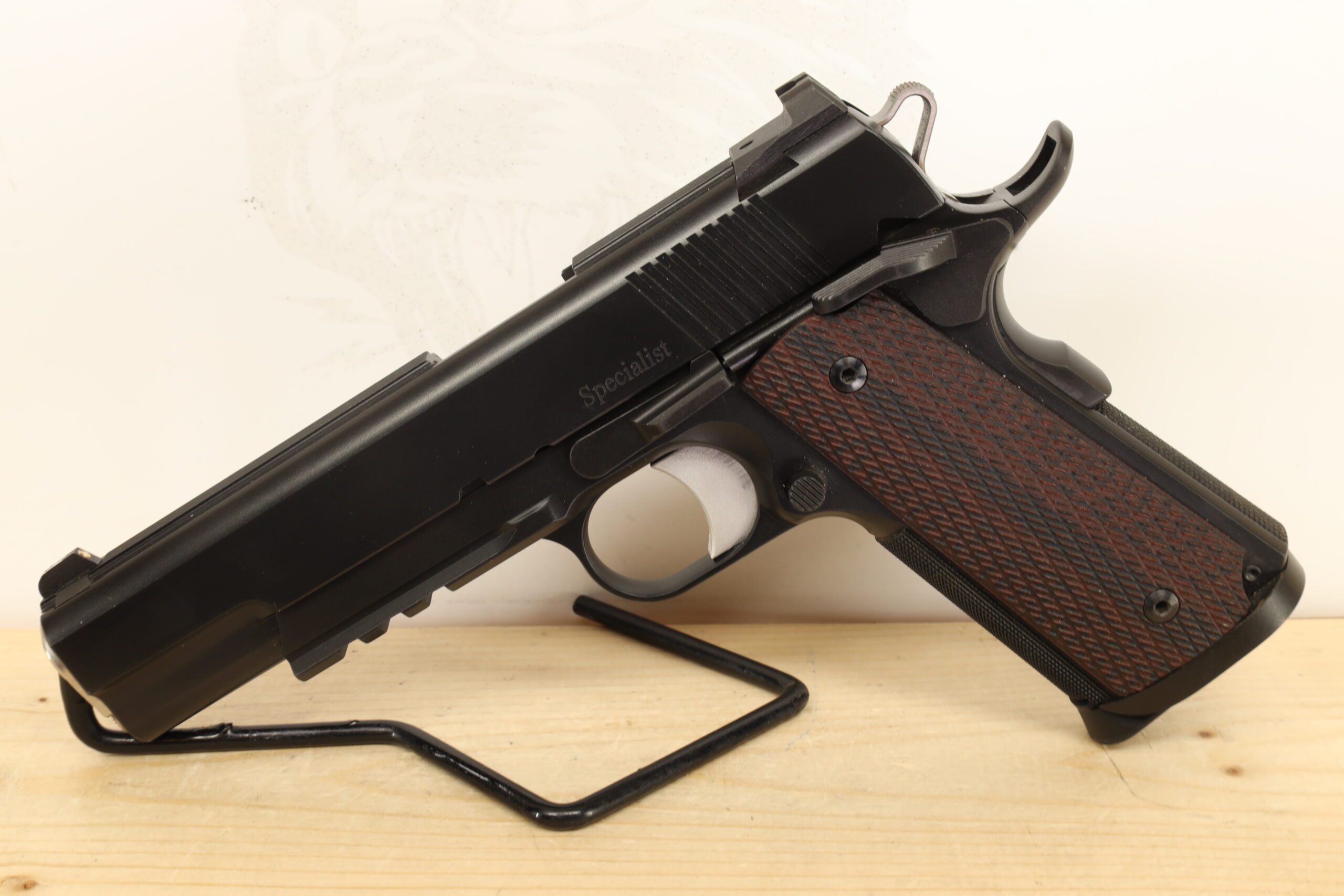 The Dan Wesson Specialist, chambered in .45 ACP, is an impressive semi-automatic handgun, utilized and maintained in great condition. Its 5-inch barrel affords users a reasonable balance between accuracy and maneuverability making it an excellent self-defense weapon. Equipped with both grip safety and thumb safety features, this firearm provides added security during handling and use. It comes with two magazines and a box or bag for storage.
