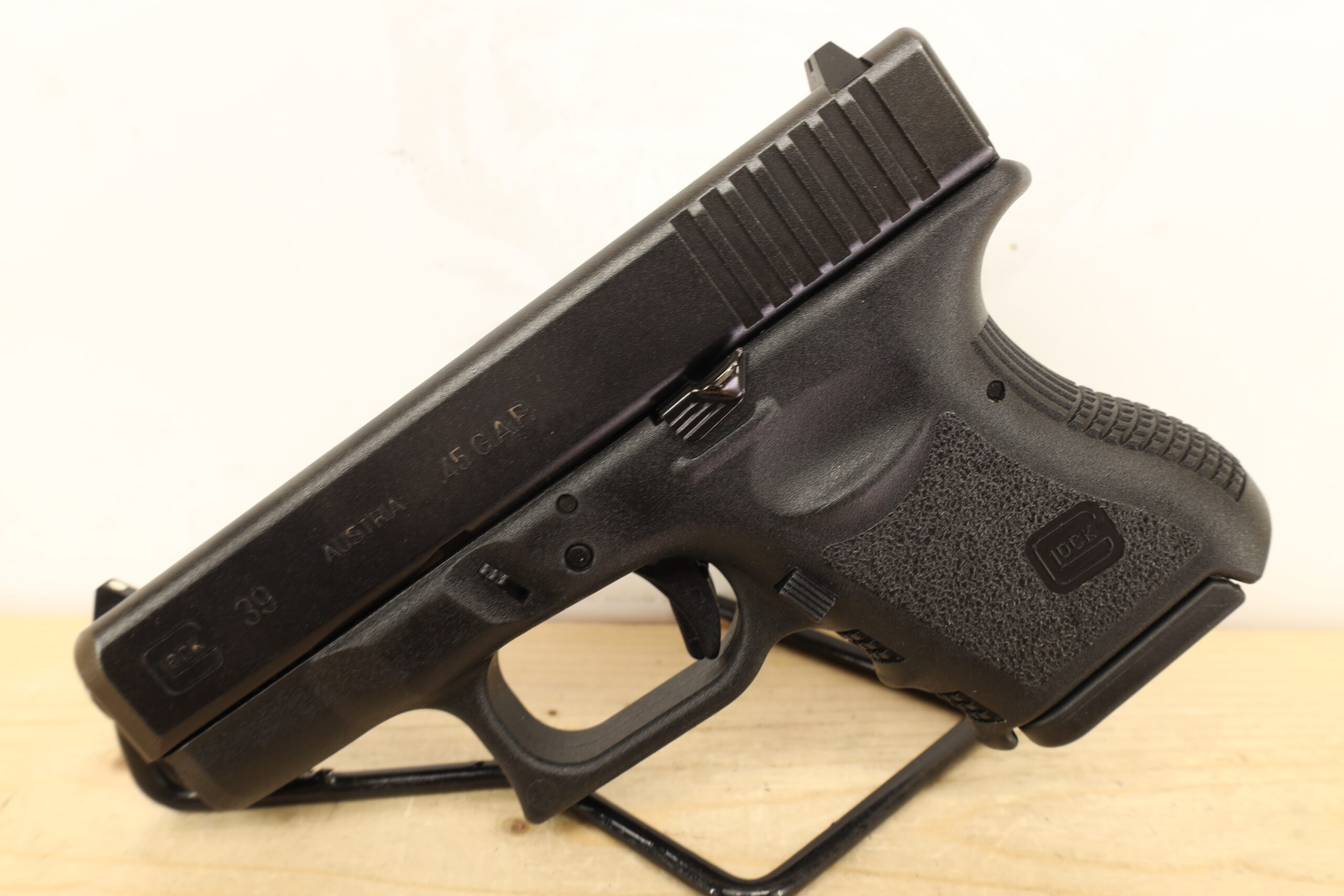 The GLOCK 39 Gen 3 is chambered in .45 GAP, a caliber designed by GLOCK to replicate the power of the .45 ACP in a cartridge more suitable for compact pistols. Known for their user-friendly operation and robust construction, GLOCKs are widely appreciated for their reliability and endurance. This particular model, the 39 Gen 3, features a convenient 3.3″ barrel length, making it suitable for concealed carry. Although it only comes with one magazine and no box, it is in great condition indicating good overall care and limited usage.