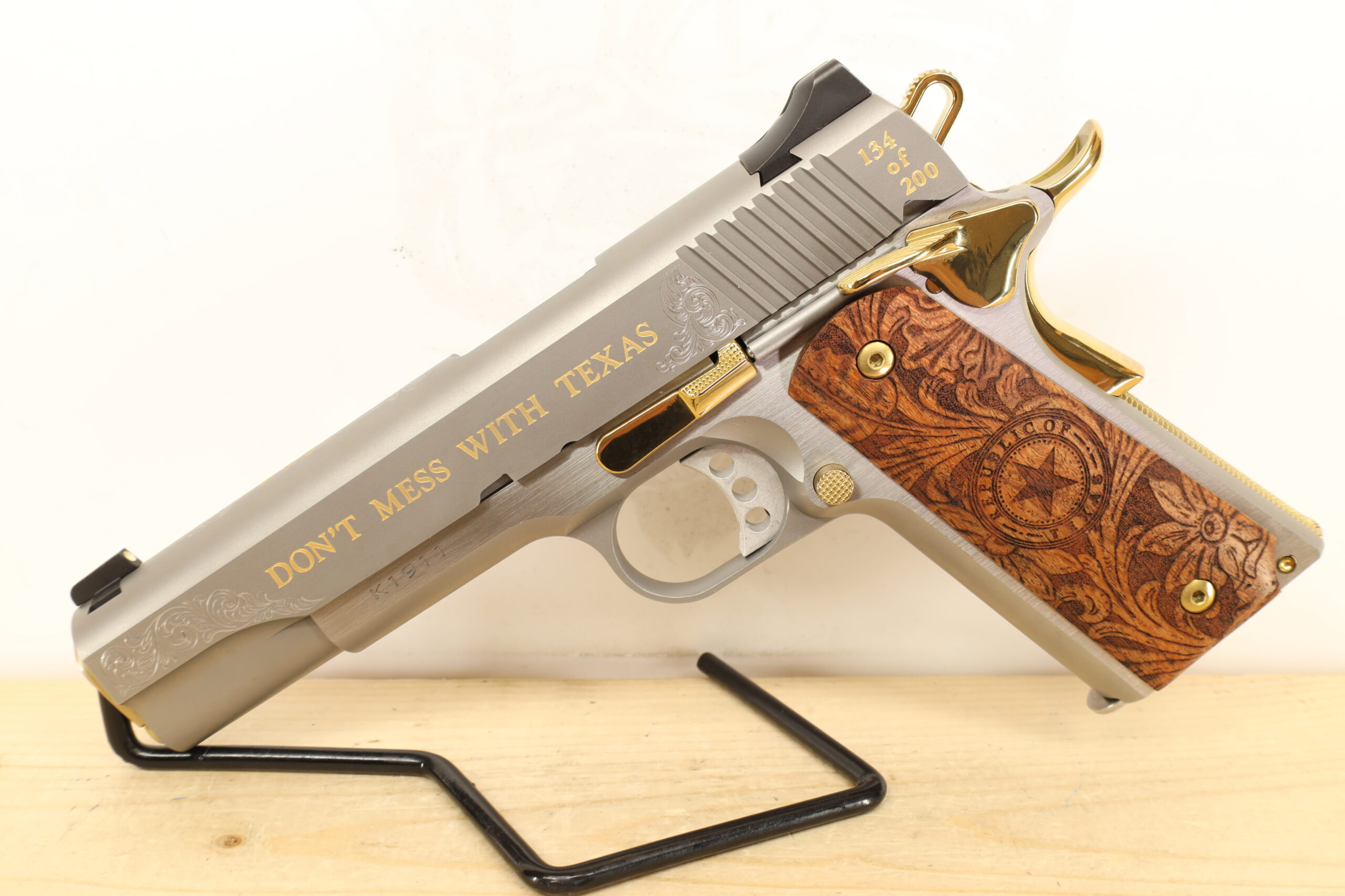 The Kimber K1911 45 ACP is a highly regarded semi-automatic pistol, known for its reliable operation and the exceptional quality of its construction. It is often praised for its impressive accuracy, reaching up to a range of around 50 yards. This handgun is notable for its integrated grip safety and thumb safety, enhancing user safety. The model presented here is used but in excellent condition and features beautiful engraving, making it a cherished addition to any collection.
