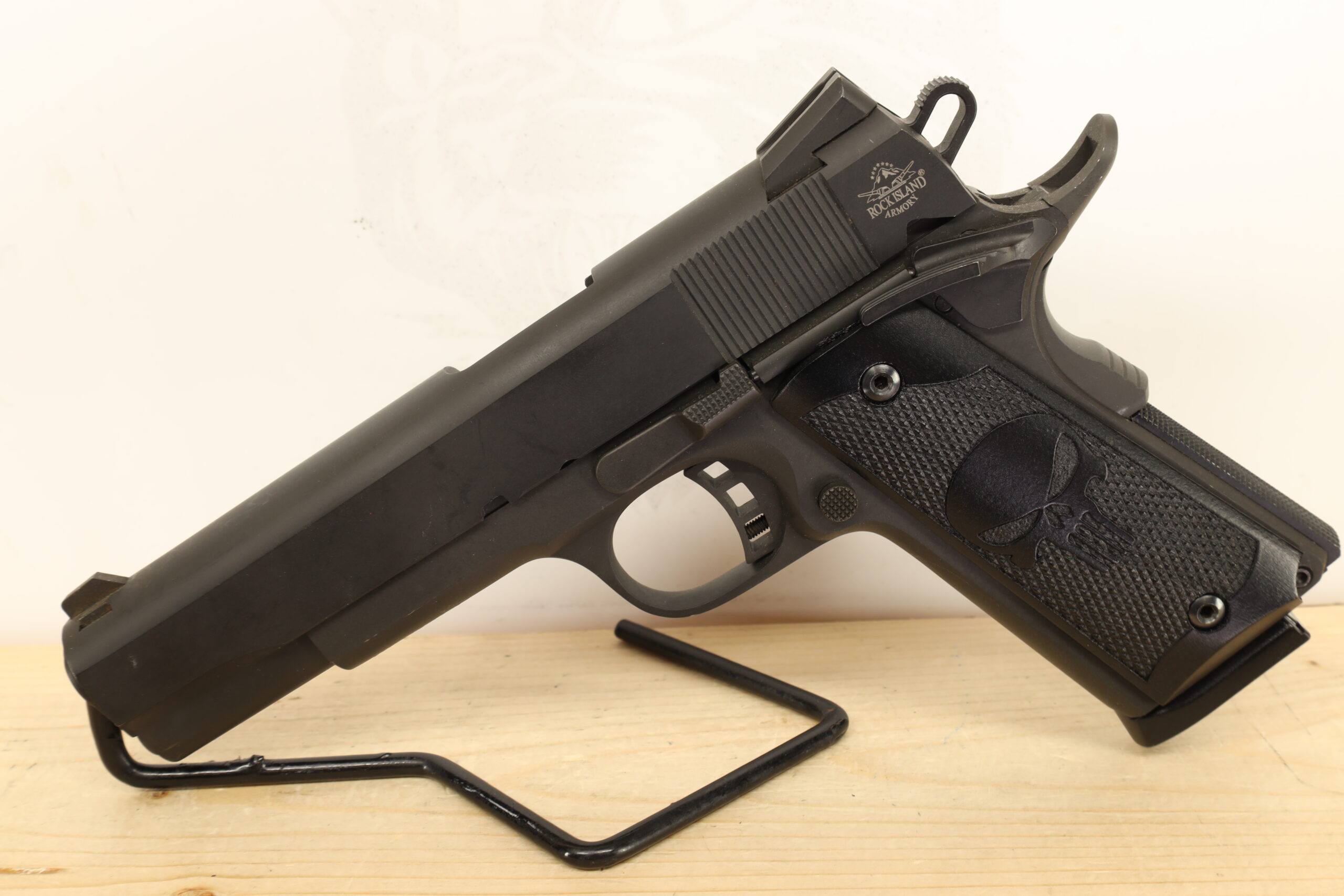 The Rock Island Armory M1911 A1-FS 45ACP is an adeptly used handgun that’s been maintained well. It sports a 5-inch barrel and features both a grip and thumb safety. Packaged with a single magazine, but without a box, this device reflects the robust durability and classic design inherent in Rock Island Armory’s M1911 series.