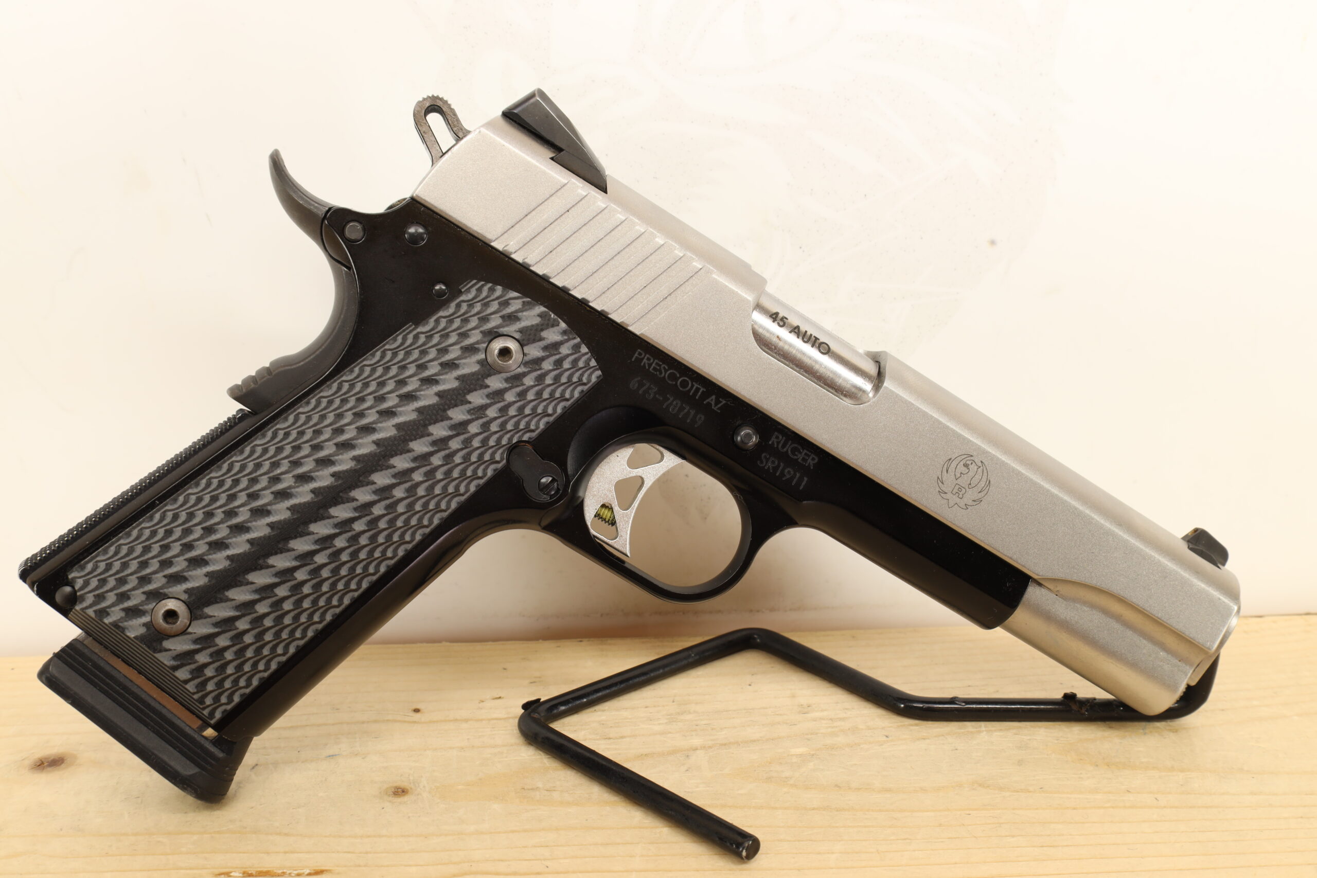 The Ruger SR1911 in the powerful 45 ACP caliber. Many enthusiasts praise SR1911 series for its classic, original 1911 fire control. This particular model, gently used and kept in peak condition, boasts a 5″ barrel known to provide excellent balance and accuracy. Ruger is a well-regarded manufacturer of reliable and durable firearms. This SR1911 includes both grip safety, and thumb safety features, enhancing secure handling and operation. Included with the handgun is a magazine, making it ready for range action.
