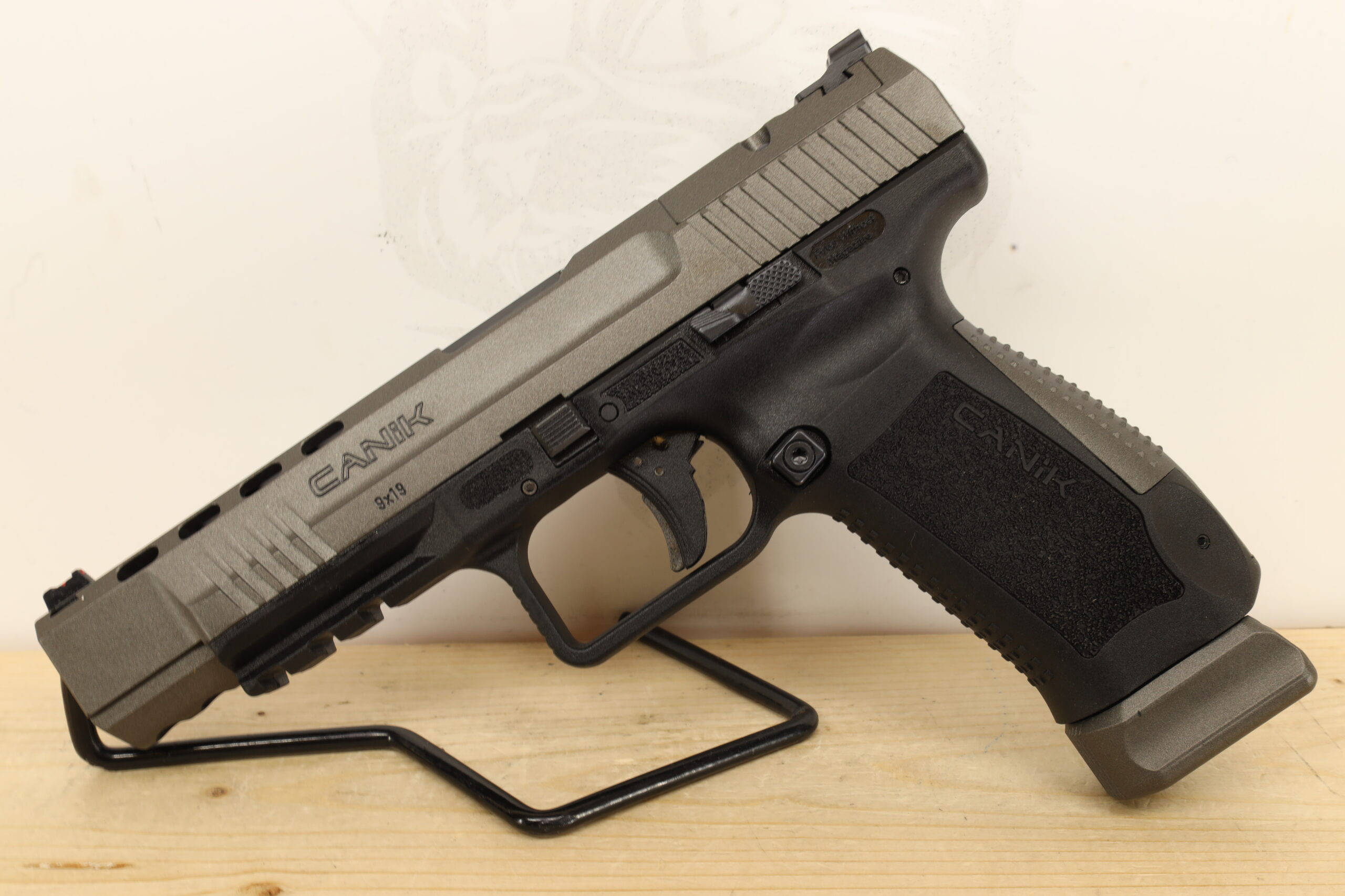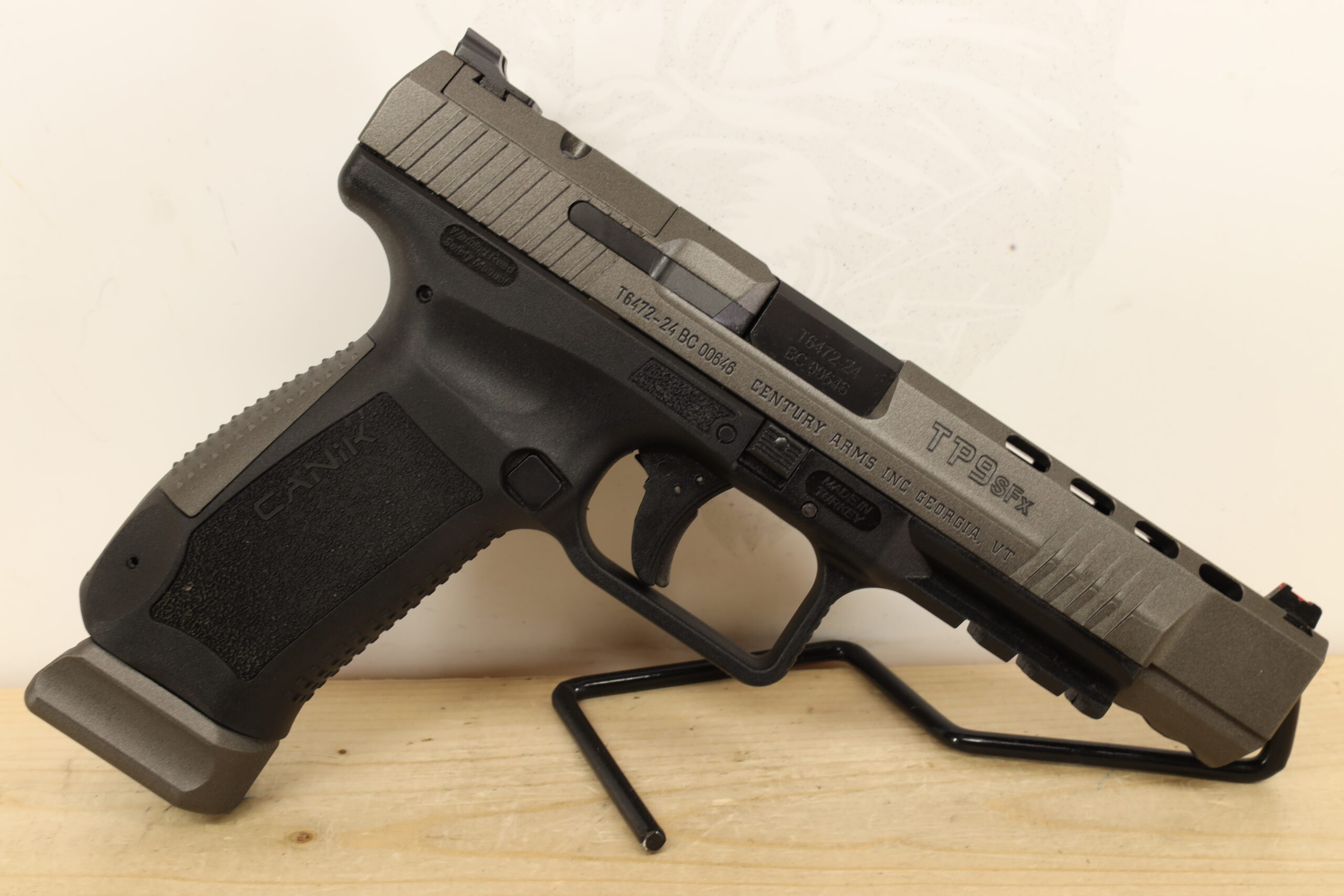The Canik TP9SFX 9x19mm, product of a collaboration between Canik and Century Arms, stands out as a versatile, competition-ready handgun. It features a 5.1″ barrel, an optic-ready slide, and comes with two magazines and a box or bag — perfectly suited for competitive shooters in all environments.