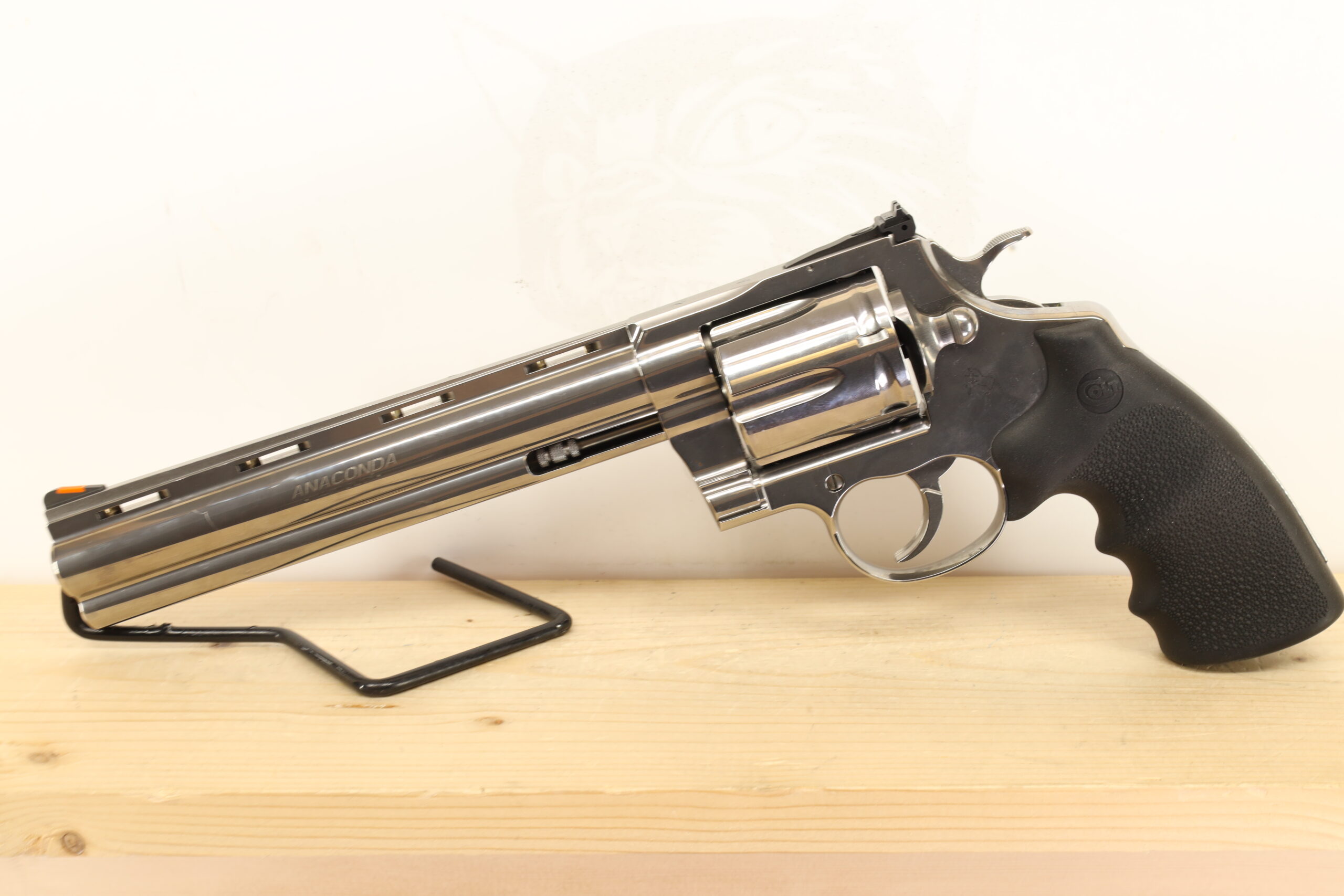 The Colt Anaconda, chambered for 44 Magnum rounds, embodies Colt’s tradition of creating high-quality firearms. This six-shooter with its 8″ barrel exudes power and reliability. Though used, it has been maintained in great condition and effortlessly returns the unique shooting experience iconic to Colt revolvers.