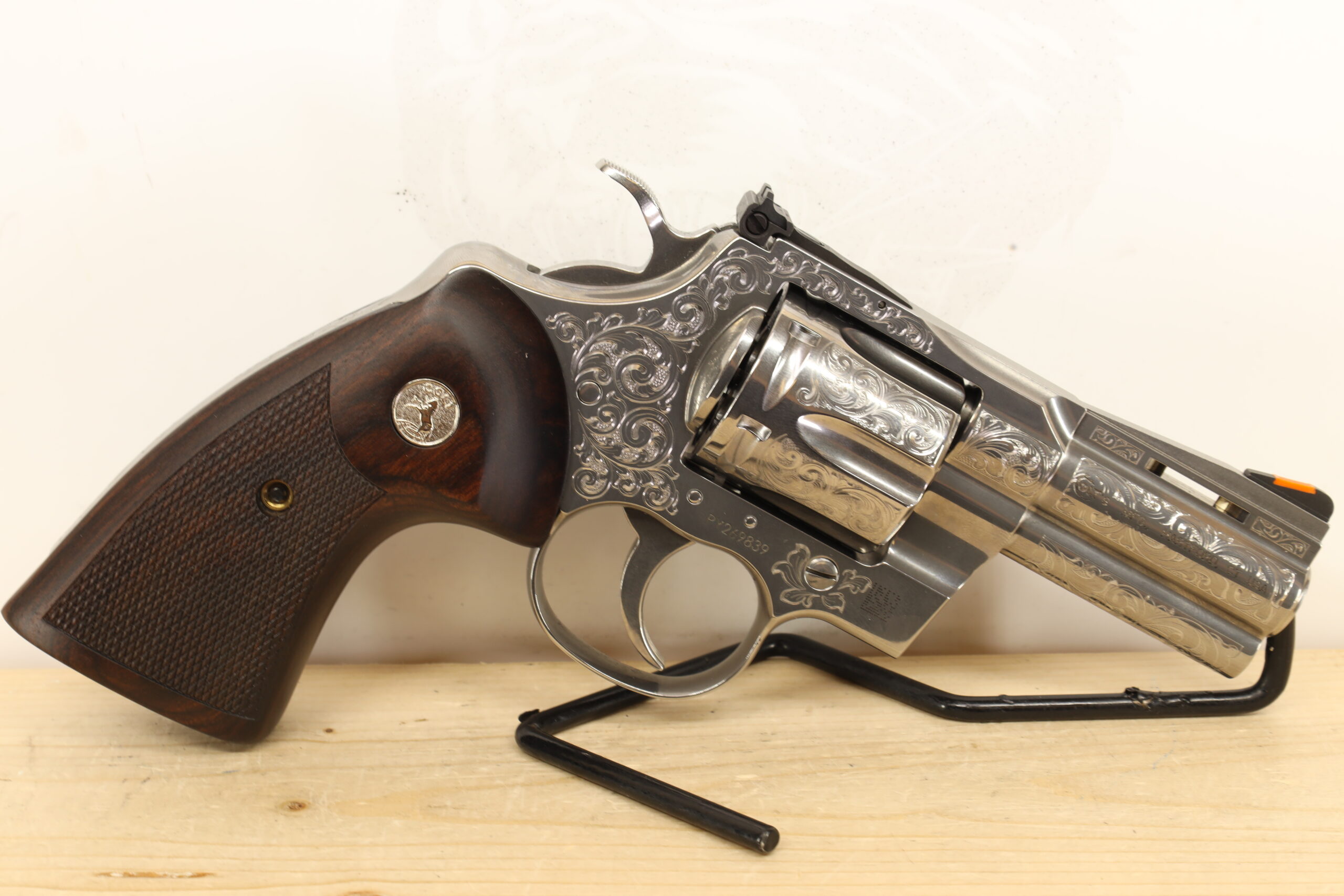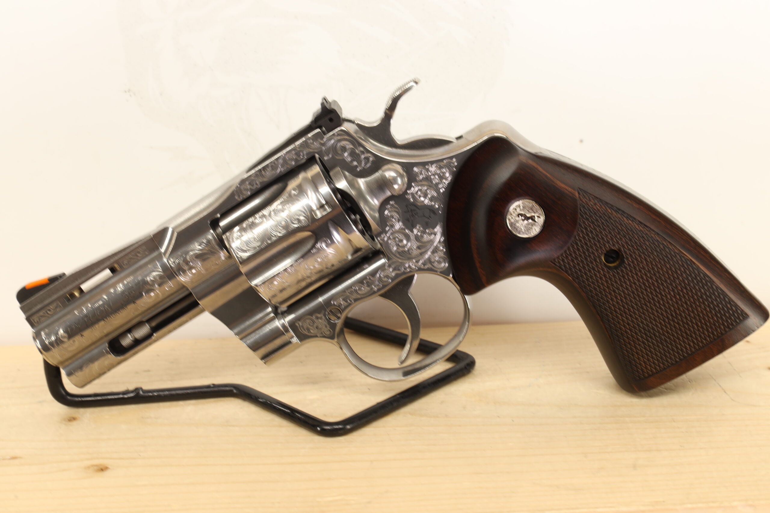 The Colt Python, chambered in 357 Magnum, redefines the standard for revolvers with its exceptionally crafted 3″ barrel and engraved design. This six-shooter remains in great condition and upholds Colt’s world-renowned reputation for producing legendary firearms.