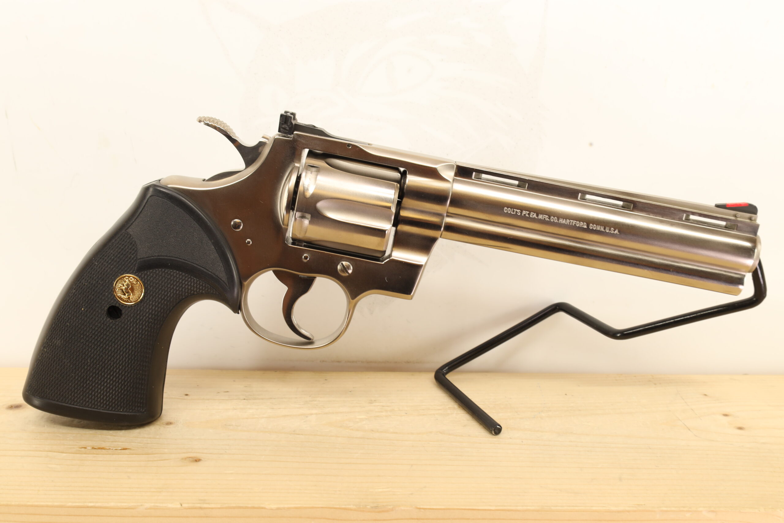 The Colt Python 357MAG is a renowned revolver for its accuracy, smooth trigger pull, and superb craftsmanship. This model has a 6″ barrel and houses a 6-shot cylinder, designed for the .357 Magnum round. It’s worth noting that Colt’s Python series has stood the test of time, demonstrating consistent performance and durability. This specific firearm includes an original box or bag for safekeeping.