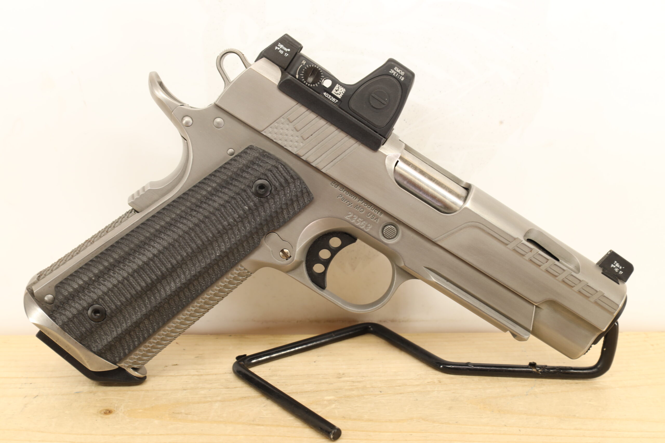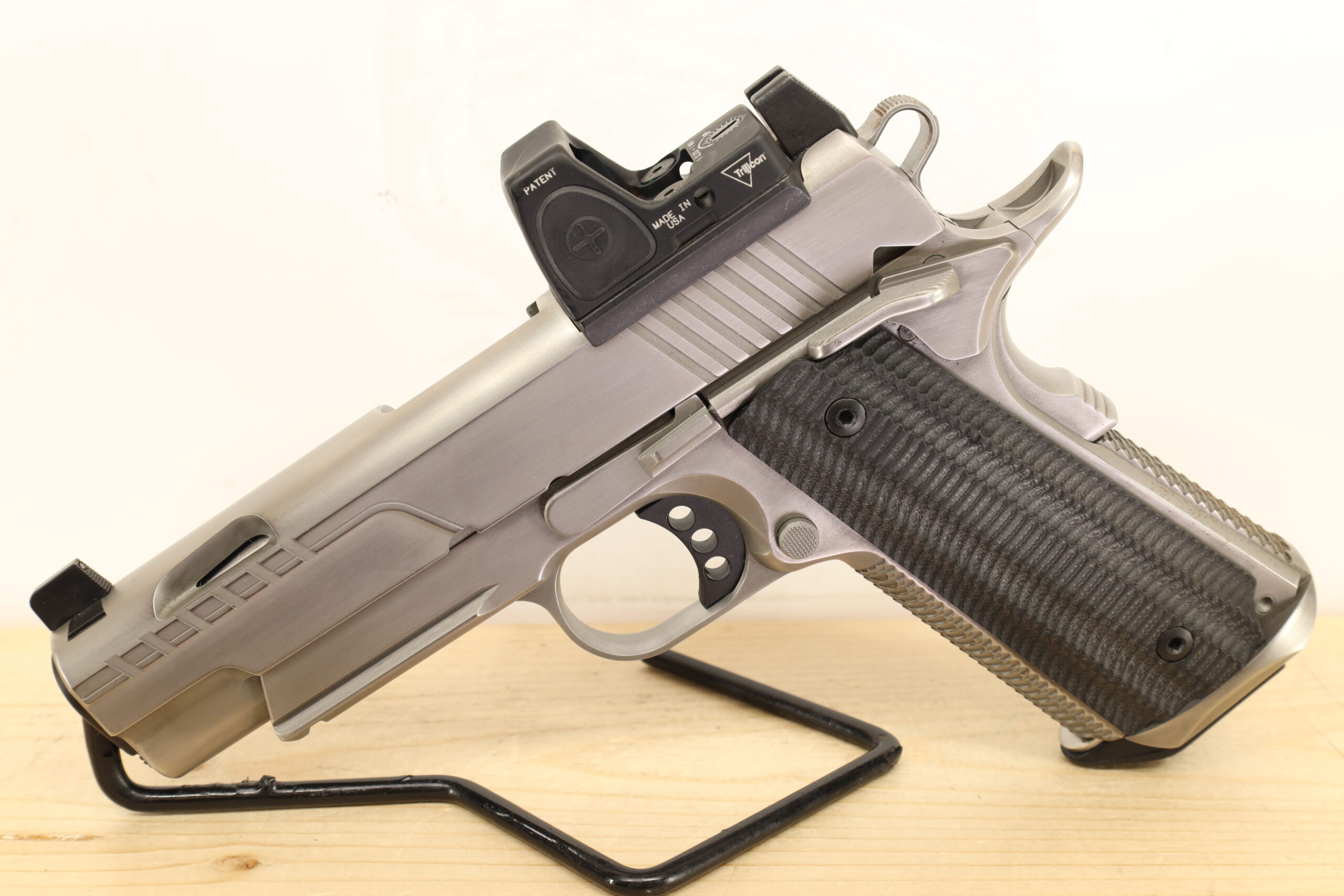 The Ed Brown FX2 is a finely crafted 9x19mm semi-automatic handgun renown for precision and quality. This used handgun has a 4.1″ barrel and is decked with a Trijicon RM06 optic. It offers both grip and thumb safeties and a magazine, all of which are securely packed in a box or bag.