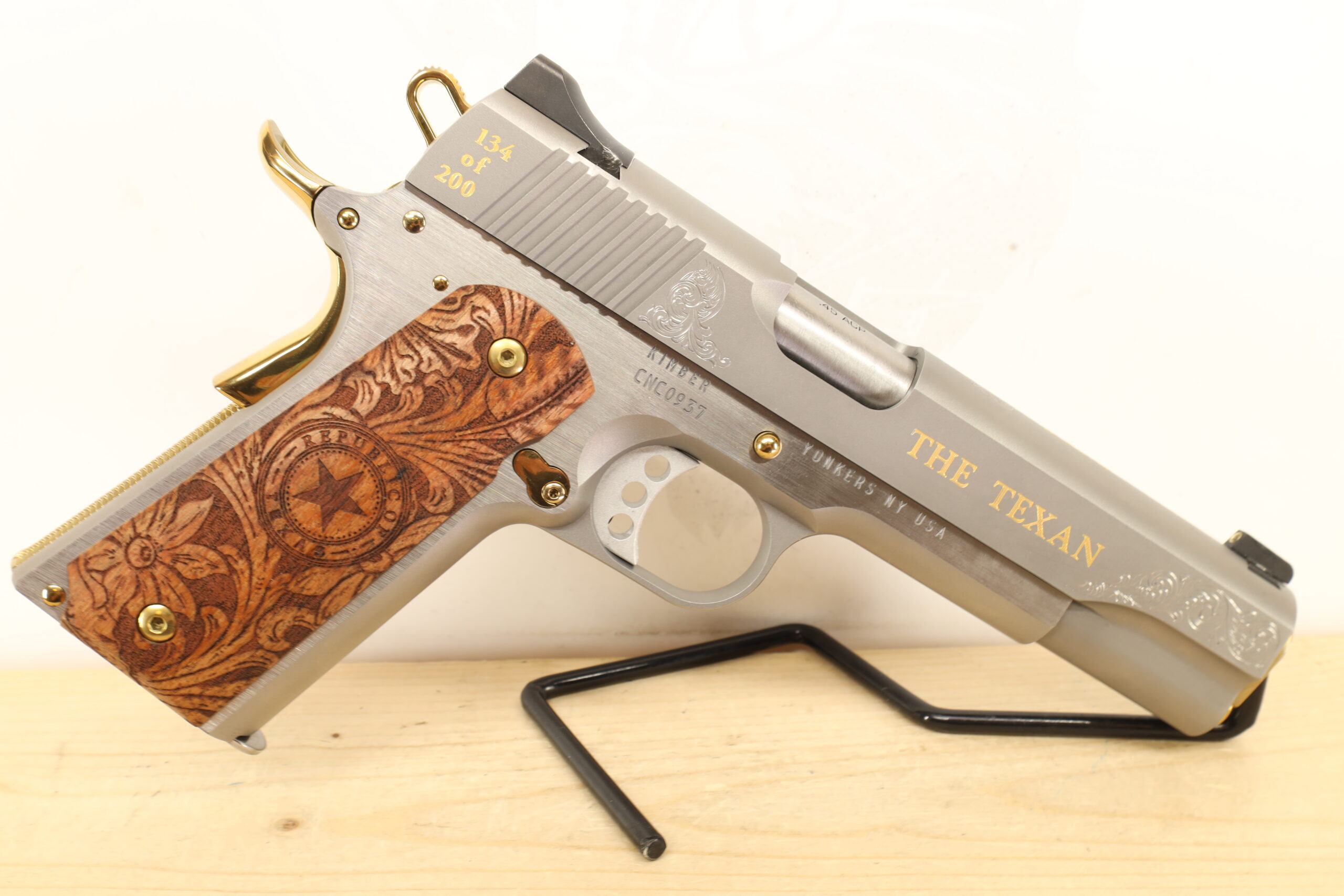The Kimber K1911 45 ACP is a highly regarded semi-automatic pistol, known for its reliable operation and the exceptional quality of its construction. It is often praised for its impressive accuracy, reaching up to a range of around 50 yards. This handgun is notable for its integrated grip safety and thumb safety, enhancing user safety. The model presented here is used but in excellent condition and features beautiful engraving, making it a cherished addition to any collection.