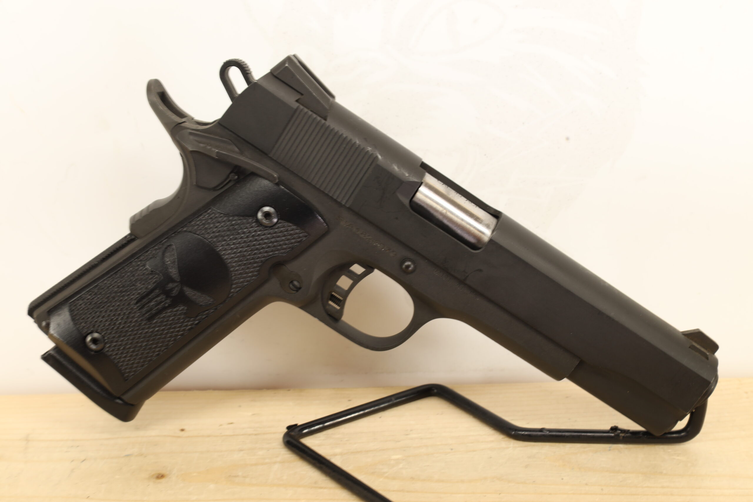 The Rock Island Armory M1911 A1-FS 45ACP is an adeptly used handgun that’s been maintained well. It sports a 5-inch barrel and features both a grip and thumb safety. Packaged with a single magazine, but without a box, this device reflects the robust durability and classic design inherent in Rock Island Armory’s M1911 series.