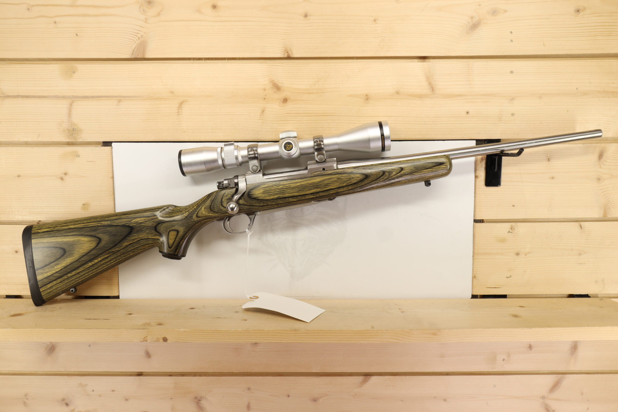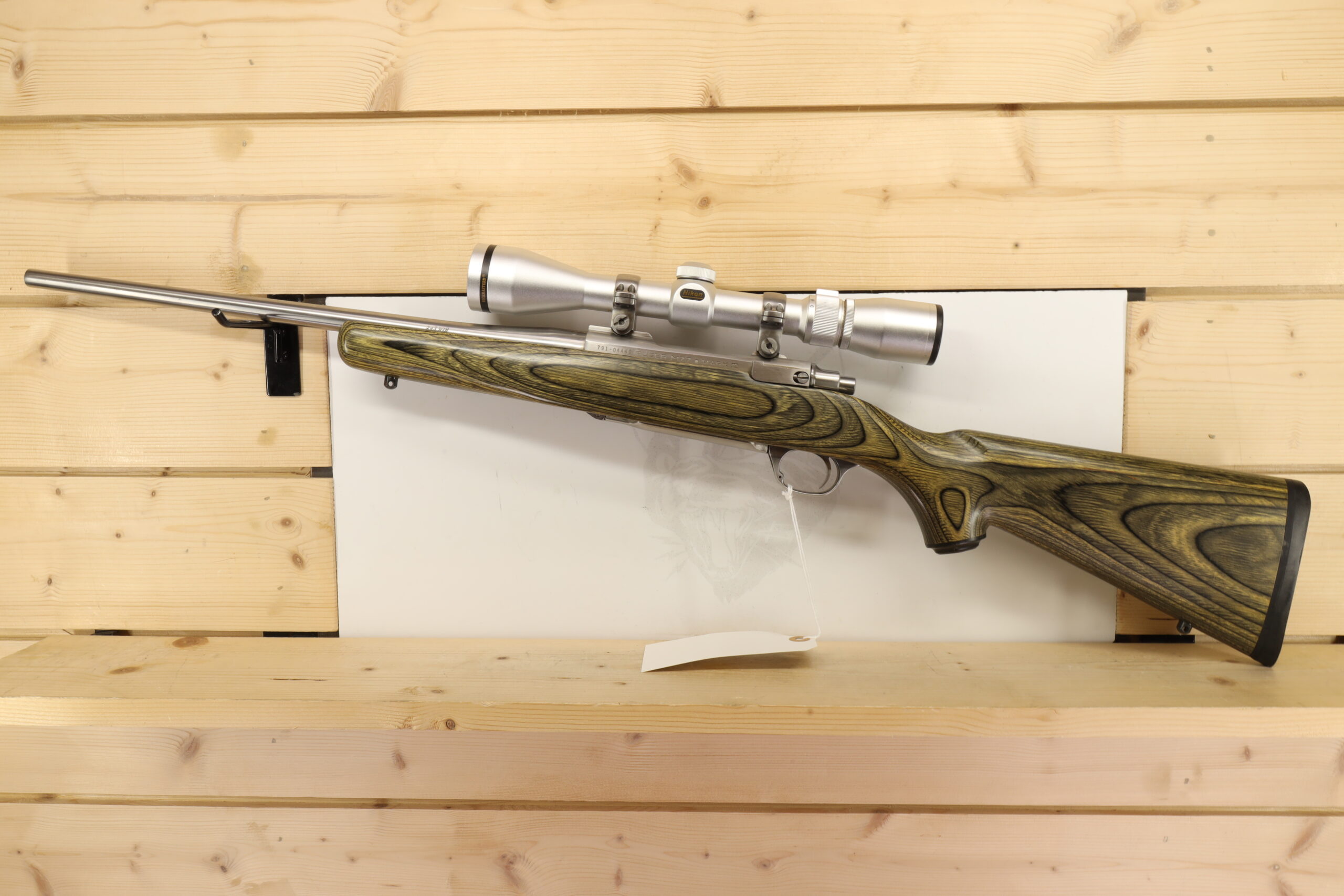 Another model by Ruger is the M77 Mark II 243WIN. Using the .243 Winchester caliber, this firearm also features a 16.5″ barrel. Its Nikon Buckmaster 3-9X scope aids versatility in several hunting scenarios. The thumb-safety feature also gives this used but well-maintained firearm an added level of security.
