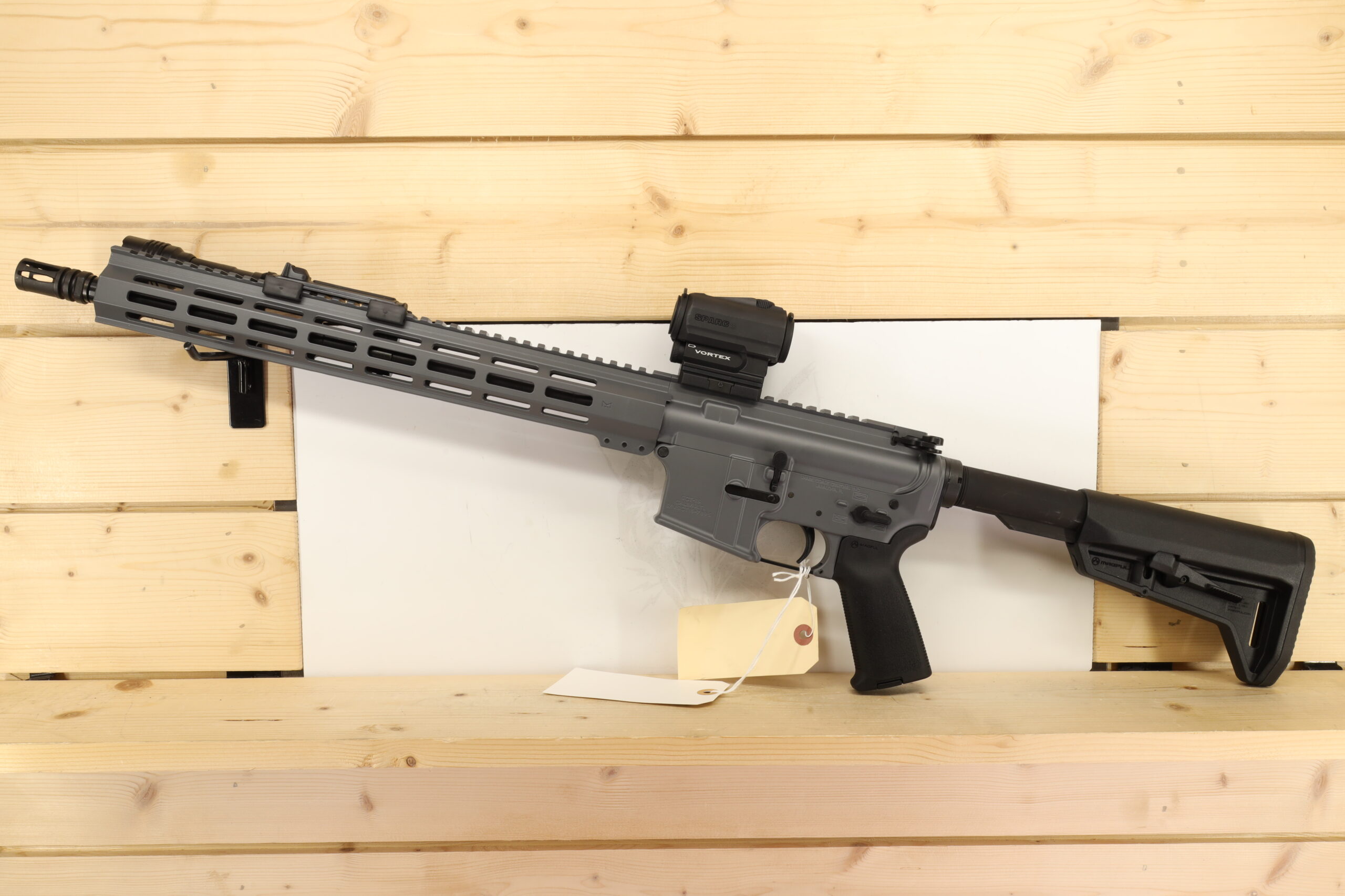 The Shark Coast Tactical Grey Knight 5.56X45MM is a remarkable new firearm. With its 16″ threaded barrel and lightweight design, it brings a modernized touch to firearm technology. The unit comes equipped with a VORTEX CROSSFIRE optic and a thumb safety feature for enhanced user comfort and security, accompanied by one magazine and its original packaging.
