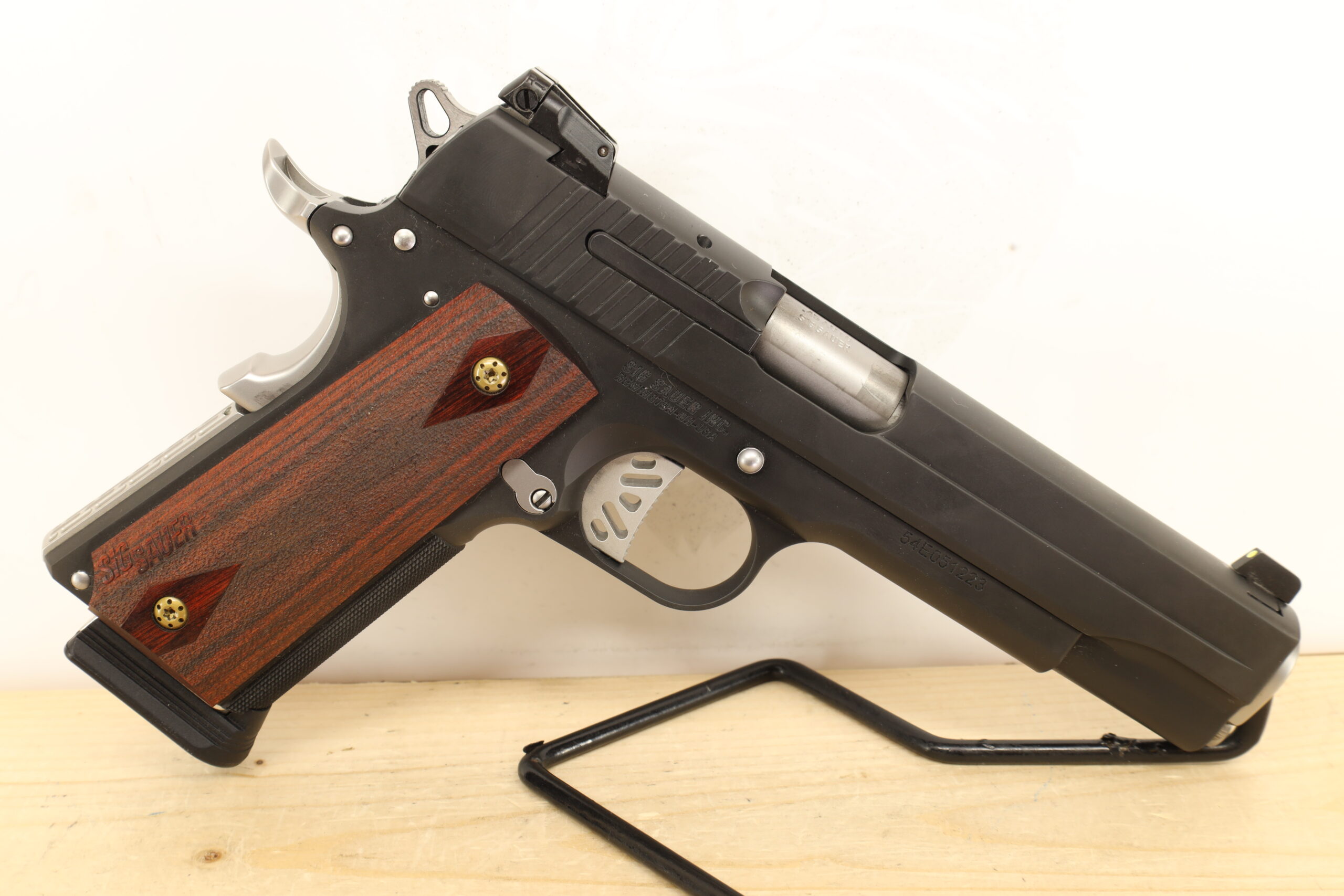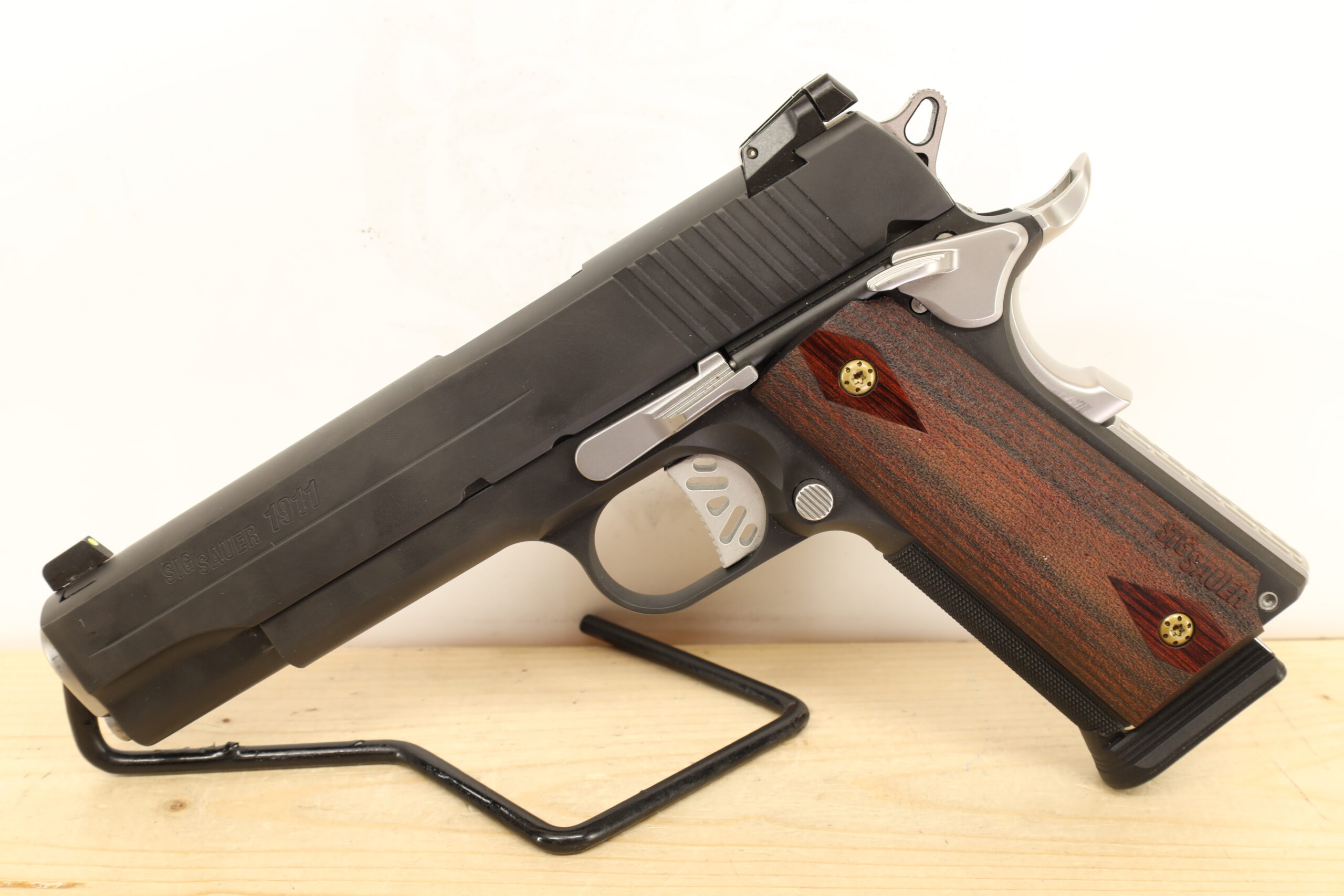 The SIG SAUER 1911, chambered in classic .45 ACP, reimagines the iconic 1911 design with modern enhancements. The model is in great used condition, boasting a 5″ barrel, grip safety, and thumb safety. The package is complete with one magazine and its original case, emblematic of SIG SAUER’s commitment to quality and precision.