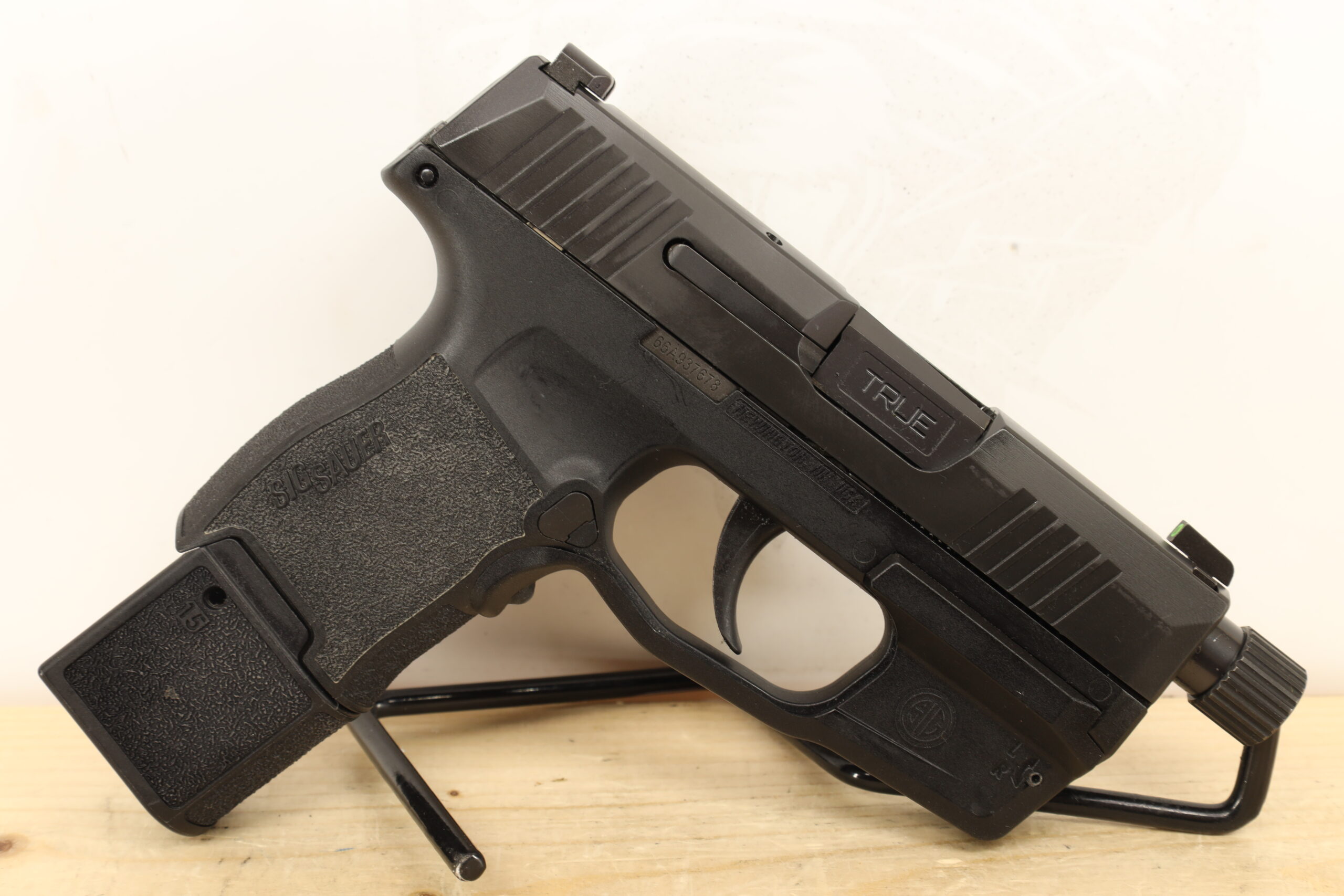 The SIG SAUER P365 is a compact 9x19mm firearm, well-regarded for its flexibility and reliability. This used firearm also includes a 3.75″ threaded barrel and is in superb condition. Unique features of this model include a laser and comes with three magazines. A case is also included for secure storage.