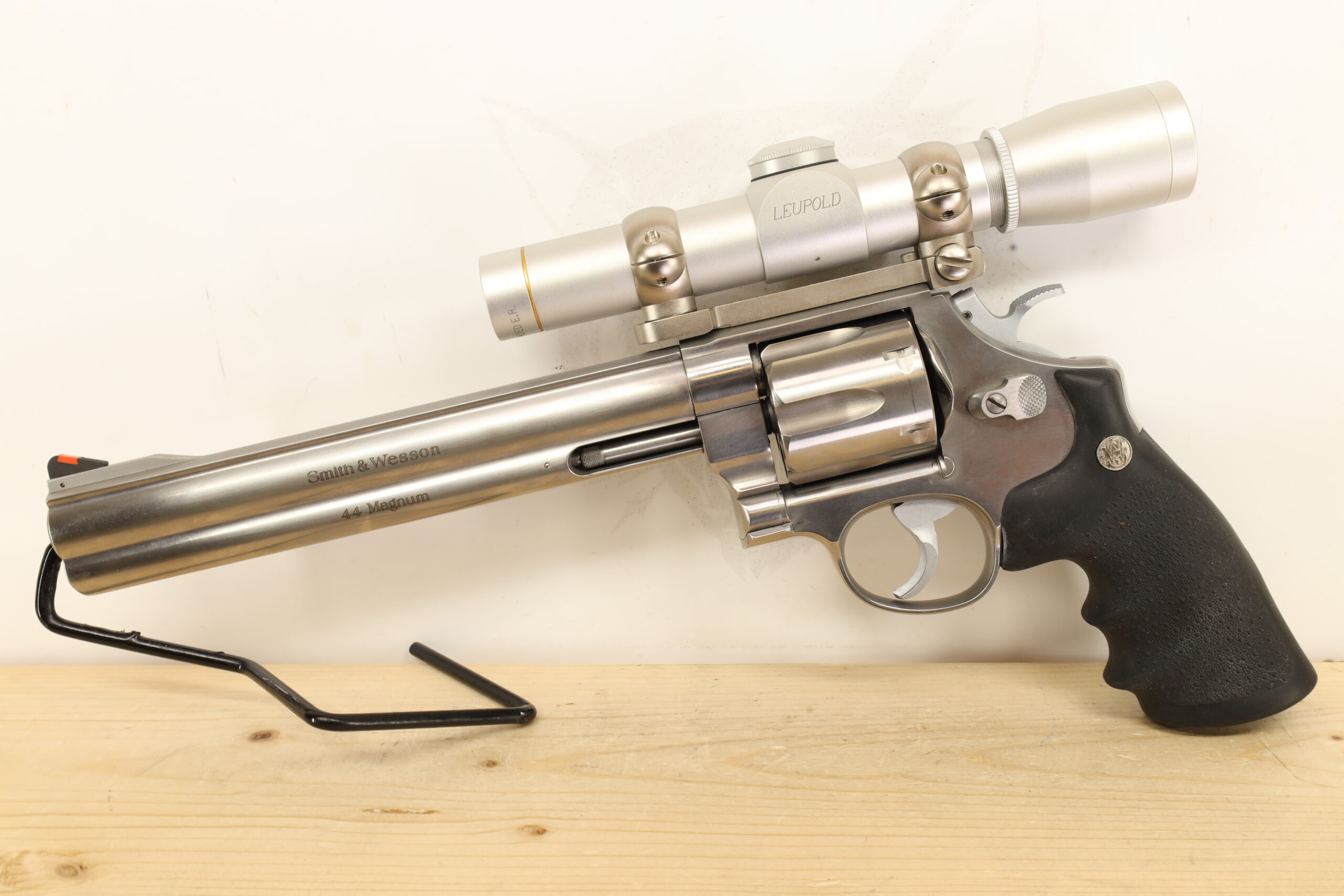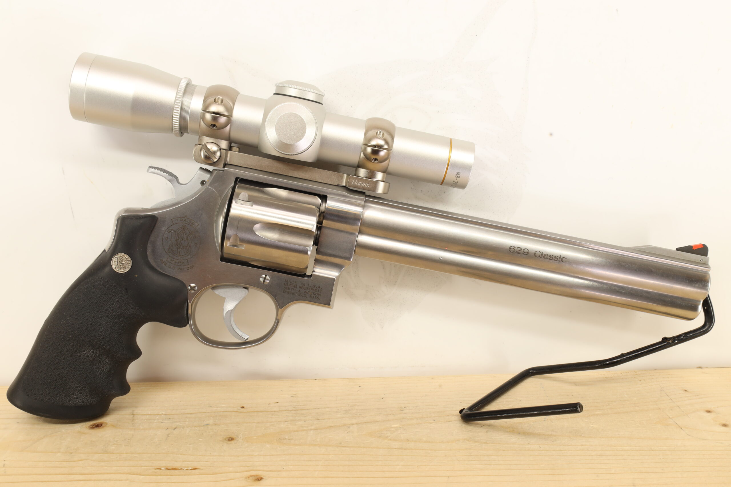 The Smith & Wesson 629-3 .44Mag is another remarkable firearm from the reputable manufacturer, known for producing reliable and high-performance firearms. This model features an extended 8.25″ barrel and a 6-shot capacity for more extensive applications. It’s also equipped with a Leupold Extended M8-2X Scope and comes with a box or bag.