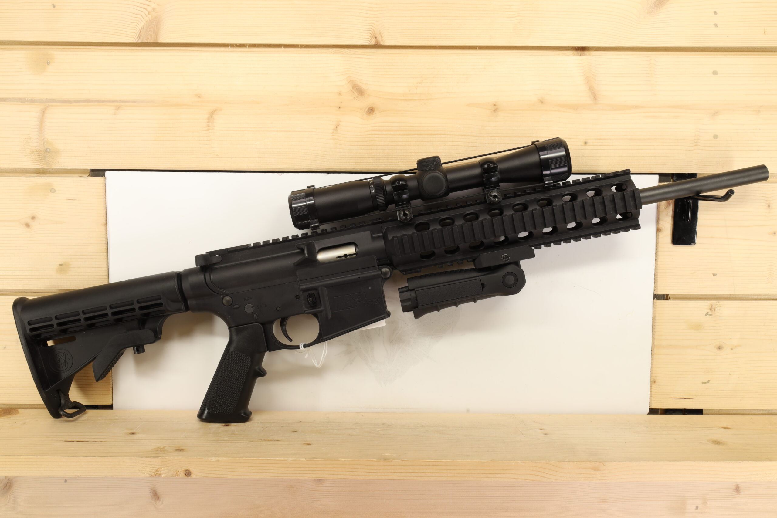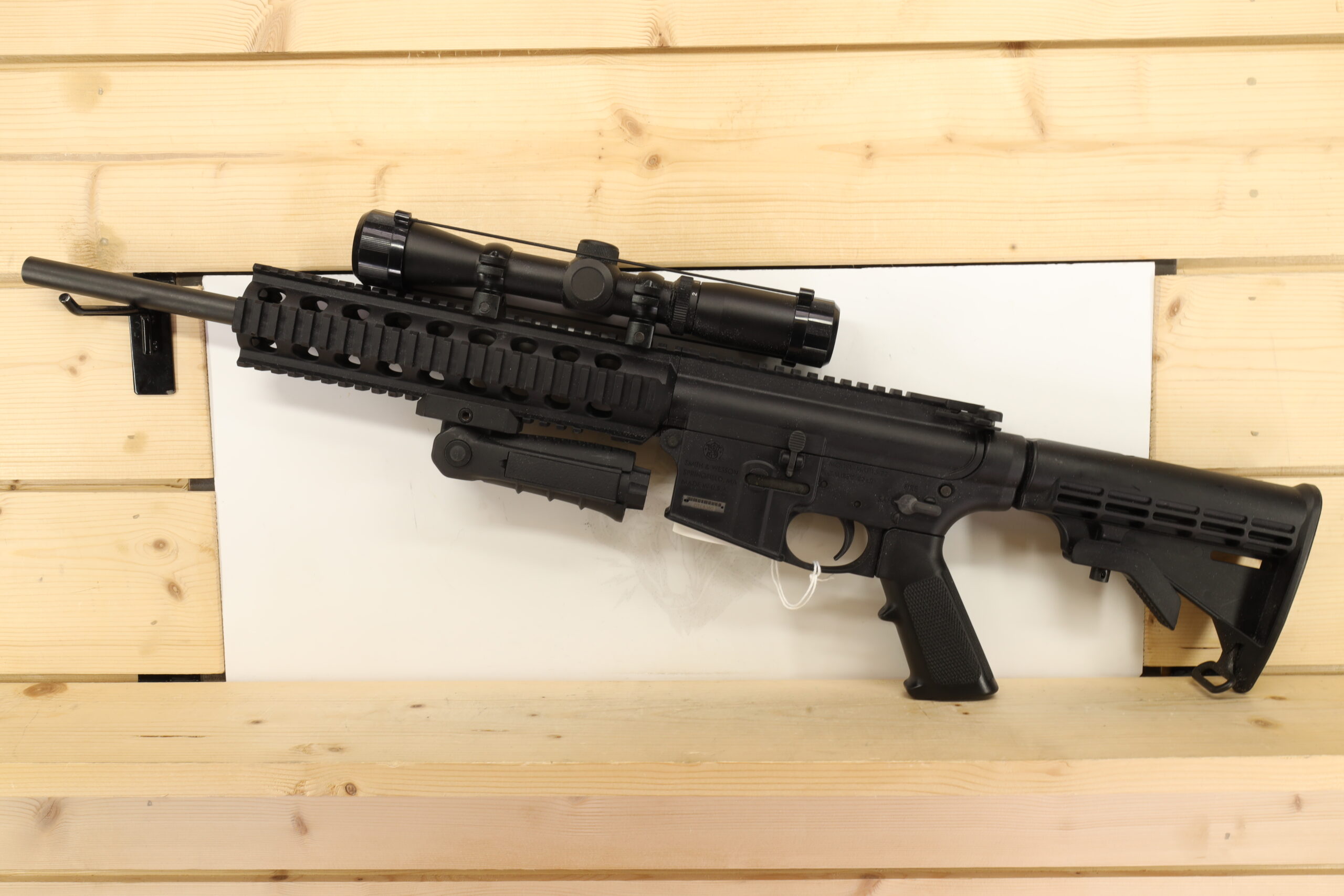 The Smith & Wesson M&P 15-22 is a versatile semi-automatic rifle, used but in great condition. It comes with a 16″ threaded barrel and an installed NCSTAR MODEL 2-7X32 scope for precision aiming. This model uses a .22 Long Rifle (22LR) caliber, making it an ideal choice for recreational shooting, competitive sports, and cutting-edge tactical use. The presence of a thumb safety is a bonus to ensure it is safely handled.