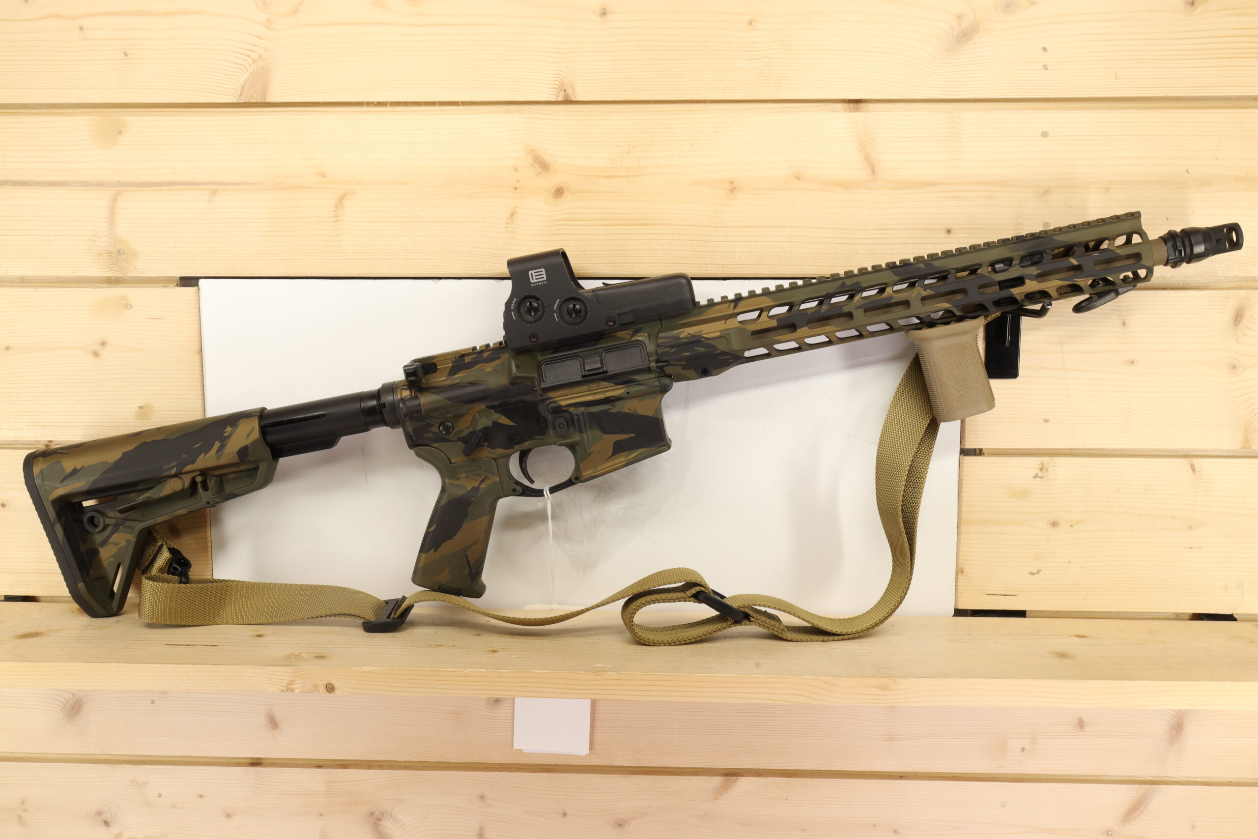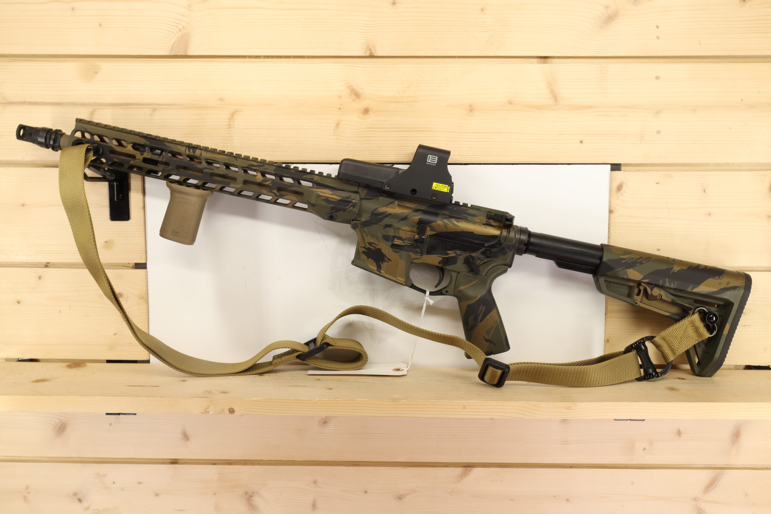 Featuring a unique 14.5-inch pin and weld barrel and a highly-functional Red Dot optic, the Stag Arms STAG-15 rifle in the 5.56x45mm chambering assures precision in every shot. Though it does not come with a magazine or box, the rifle’s thumb safety, and additional strap highlight its ergonomic design and emphasis on shooter comfort.