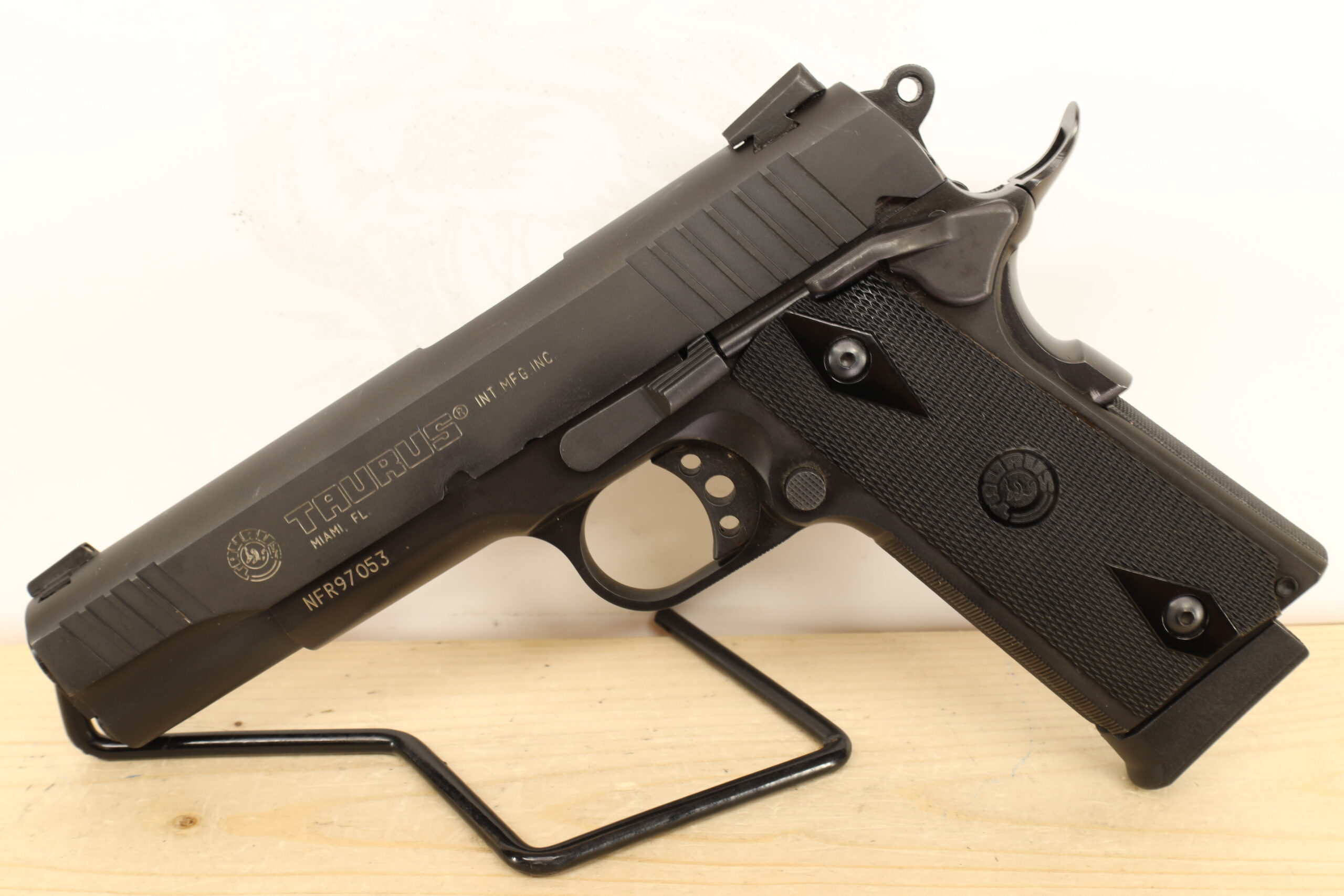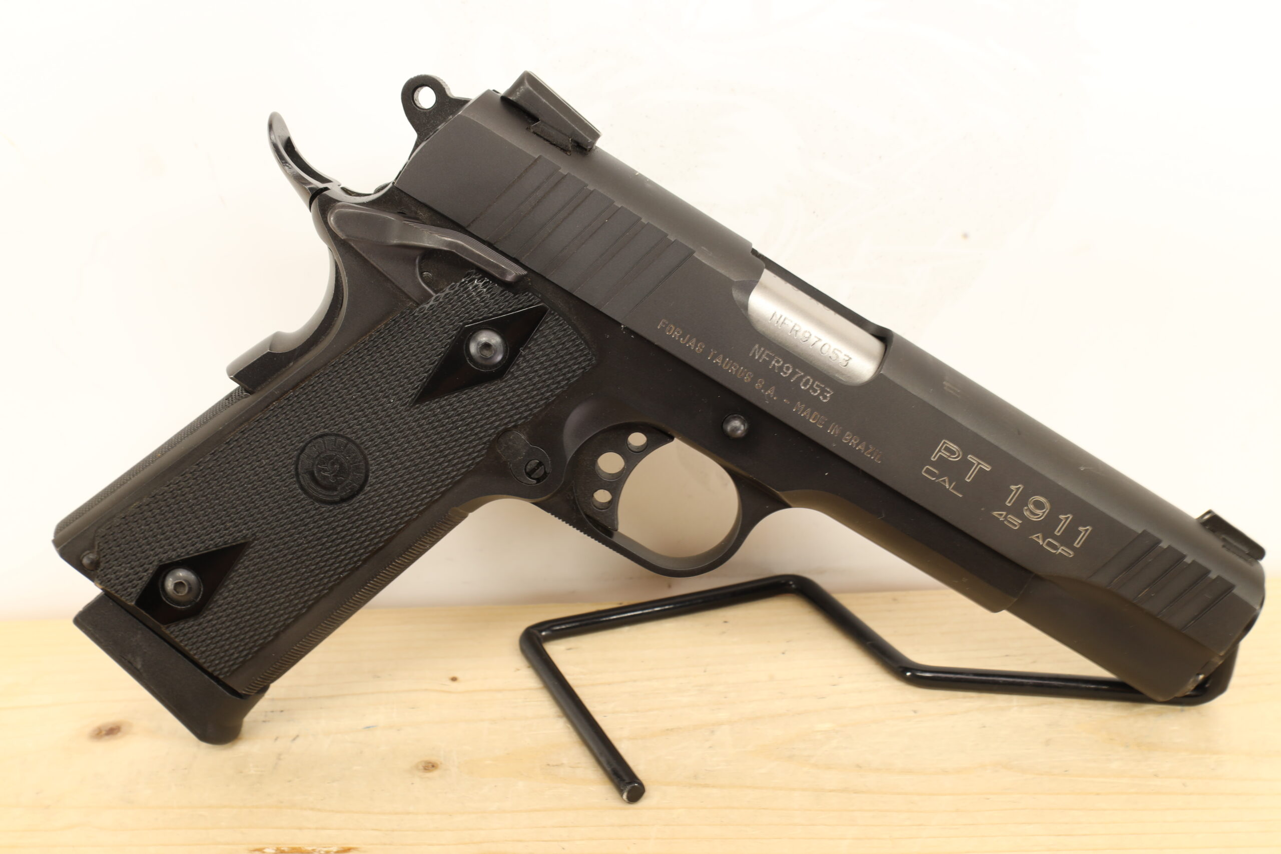 The Taurus PT 1911 in .45ACP is a trusted semi-automatic handgun featuring a 5″ barrel. This used model is in great condition and comes with a grip safety and thumb safety for secure handling. It includes 2 magazines, making it convenient for quick reloading, and it comes with a box or bag for easy storage and transportation.